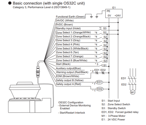 - onnect the two Safety Outputs of the OS32C to SI0 and SI1 (red and yellow wires in the image below)