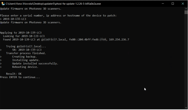 Once the update finishes, the user can close the console window, disconnect the sensor from the laptop and reconnect it to the AMM.