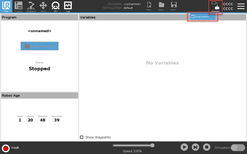 4. Click the teach pendant icon on the upper right and select Remote Control from the run tab