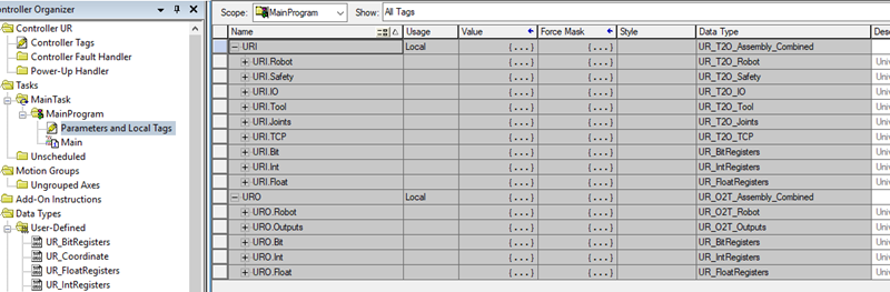 10.1. IF You did not use the demo, but will implement communication to your own code, you need to enable communication between the robot and the AB PLC. First set up URI and URO in your local or global variables, using the provided User Define Data Types:
