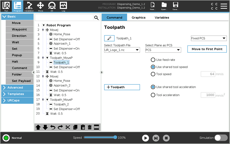 The program and installation files (Dispensing_Demo_1.2.urp, Dispensing_Demo_1.2.installation) and the G-code files (UR_Logo_1.nc and UR_Logo_2.nc) are available at the bottom of the page.