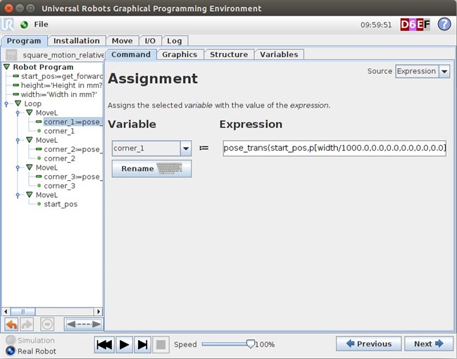 The TCP is moving within a loop through the other three corners of the square using MoveL movements with variable positions. These positions are calculated using the script function pose_trans (), with the start position as first argument, and using the values assigned by the operator in its second pose argument to define the dimensions of the rectangle (X and Y).