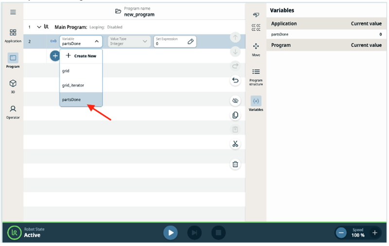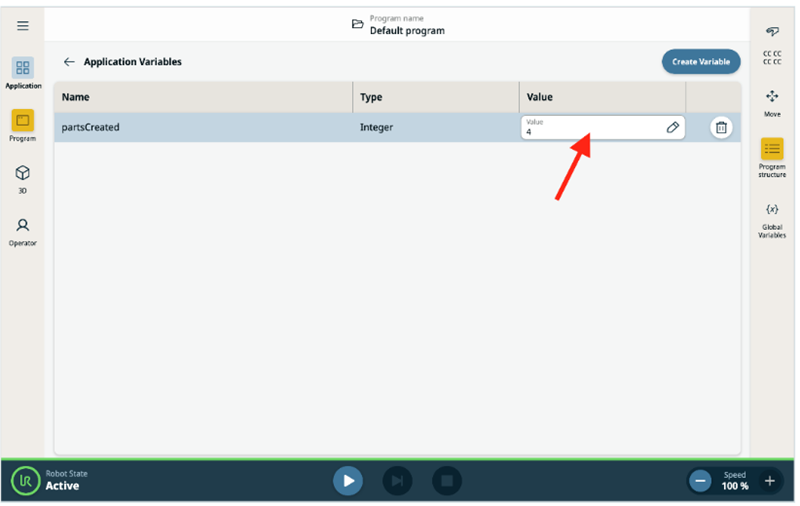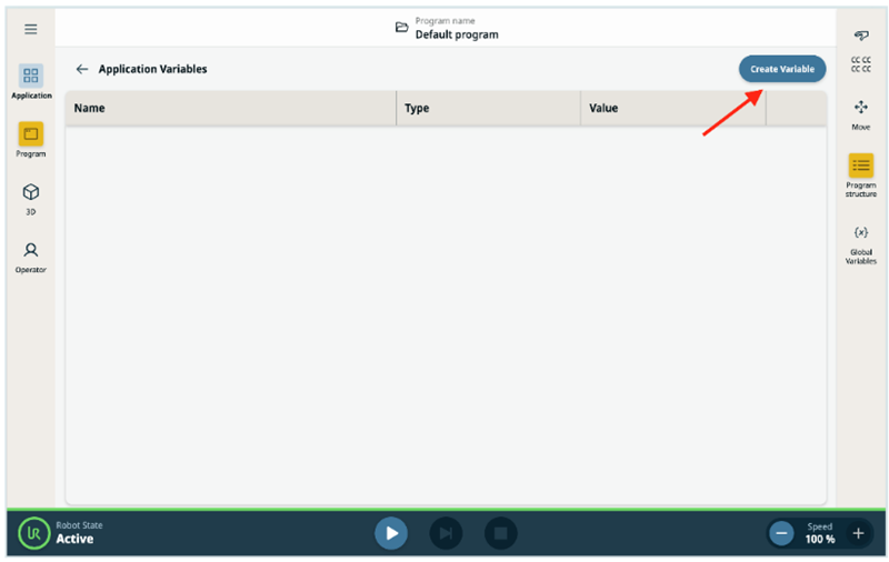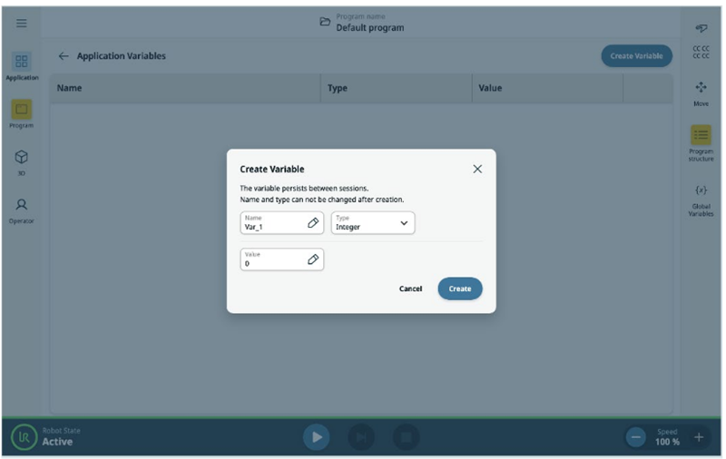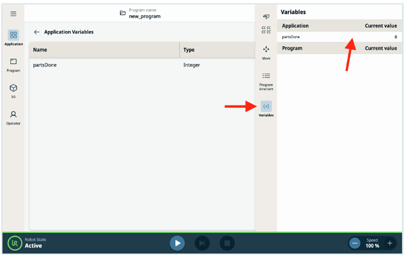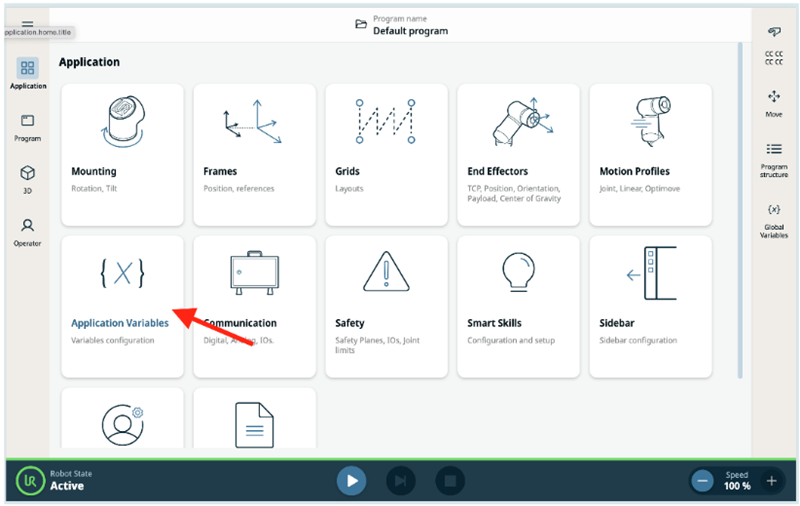 PolyScope X UI allows users to define Application Variables that persist across program runs and robot restarts. These variables behave like any other program variable and are exported together with the program.
