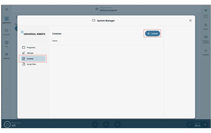 This feature allows users to easily add licenses from Universal Robots to activate new software capabilities and robot features.