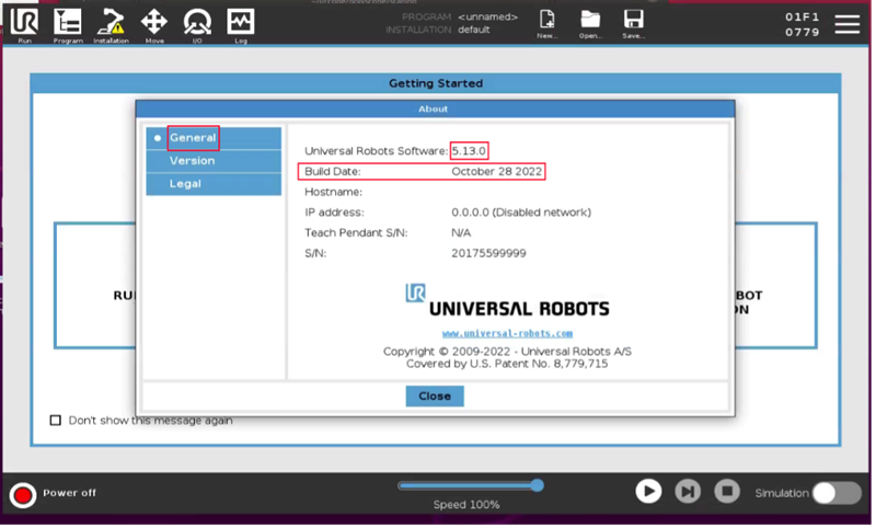 The "Universal Robots Software" field now only displays the software version number instead of the longer string from previous software versions, e.g. "URSoftware 5.12.4.1101661 (Aug 31 2022)".