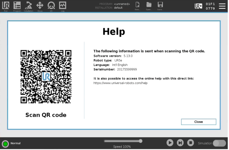 The built-in PolyScope help (accessible through the Hamburger menu) has been replaced with a new Help screen with a single QR code pointing to https://help.universal-robots.com, in order to improve compatibility across PolyScope versions and ensure up-to-date help content. The online-based user manuals can be accessed for online browsing by scanning the QR code.
