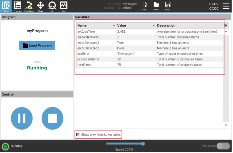By default, a list of all program variables and installation variables used by a running program are displayed on the Run tab screen and on the Variables tab (in the Program tab screen). Now, it is also possible to show a list of selected variables by using the new option to only show favorites variables on these screens.