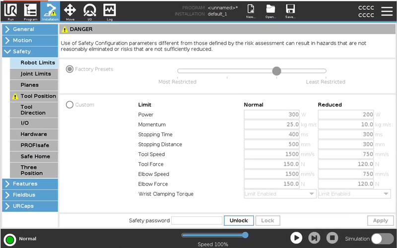 Not safety rated: This setting also defines an upper limit to the applied torque windows of base, shoulder, and elbow joint. Achievable contact forces may be significantly lower than specified in the Tool Force Limit and Elbow Force Limit.