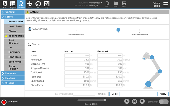Robot limits configured in the Safety settings can influence whether protective stops occur during cold start-up. Universal Robots provides factory preset levels ranging from Most Restricted to Least Restricted, and the user can also define custom limits for parameters such as force, power, speed, momentum, stopping time, and stopping distance.