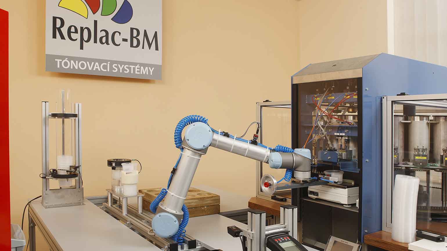 To reach that next level in precise paint production, REPLAC-BM acquired a micro dispenser, a spectrophometer, and a UR5 robot to operate both. Equipped with customized gripping devices, the robotic arm handles delicate tasks such as moving cups from micro-dispenser to mixing machine, applying lids, inserting colour cards into a barcode reader, and measuring the finished hue with the spectrophometer. The robot manages all steps of the process - except those where the sensitivity of the human hand is indespensable - completely on its own and 10 times faster than the average technician.