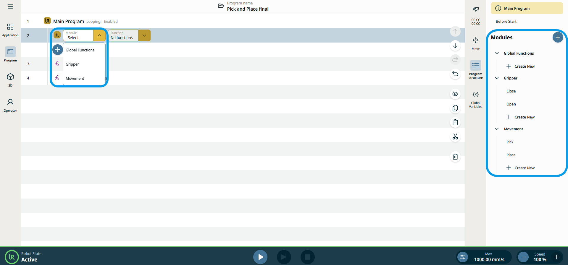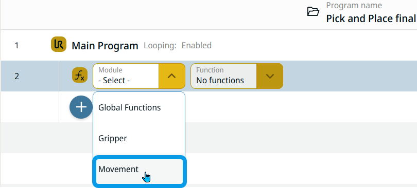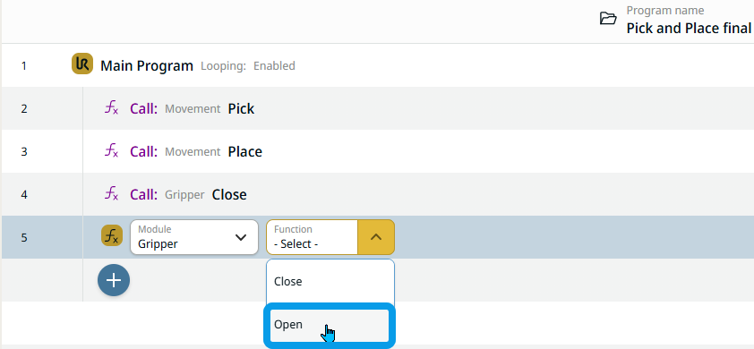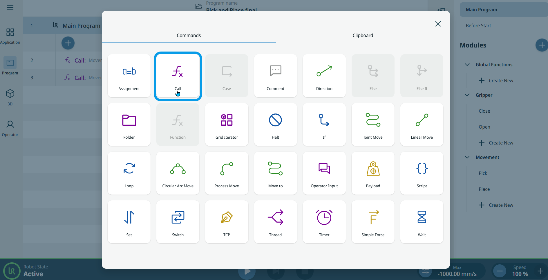 The Call command enables you to execute and run created global functions and modules, which are seen in the multitask screen. To use this command, a prior program creation using modules and functions is a requisite. In Modules and Functions, you can read how to set up commands and group them into modules and functions. The sections Gripper Module and Movement Module provide details about each. The sections Open/Close functions and Pick/Place functions provide details.