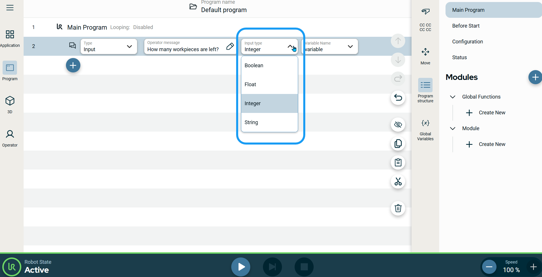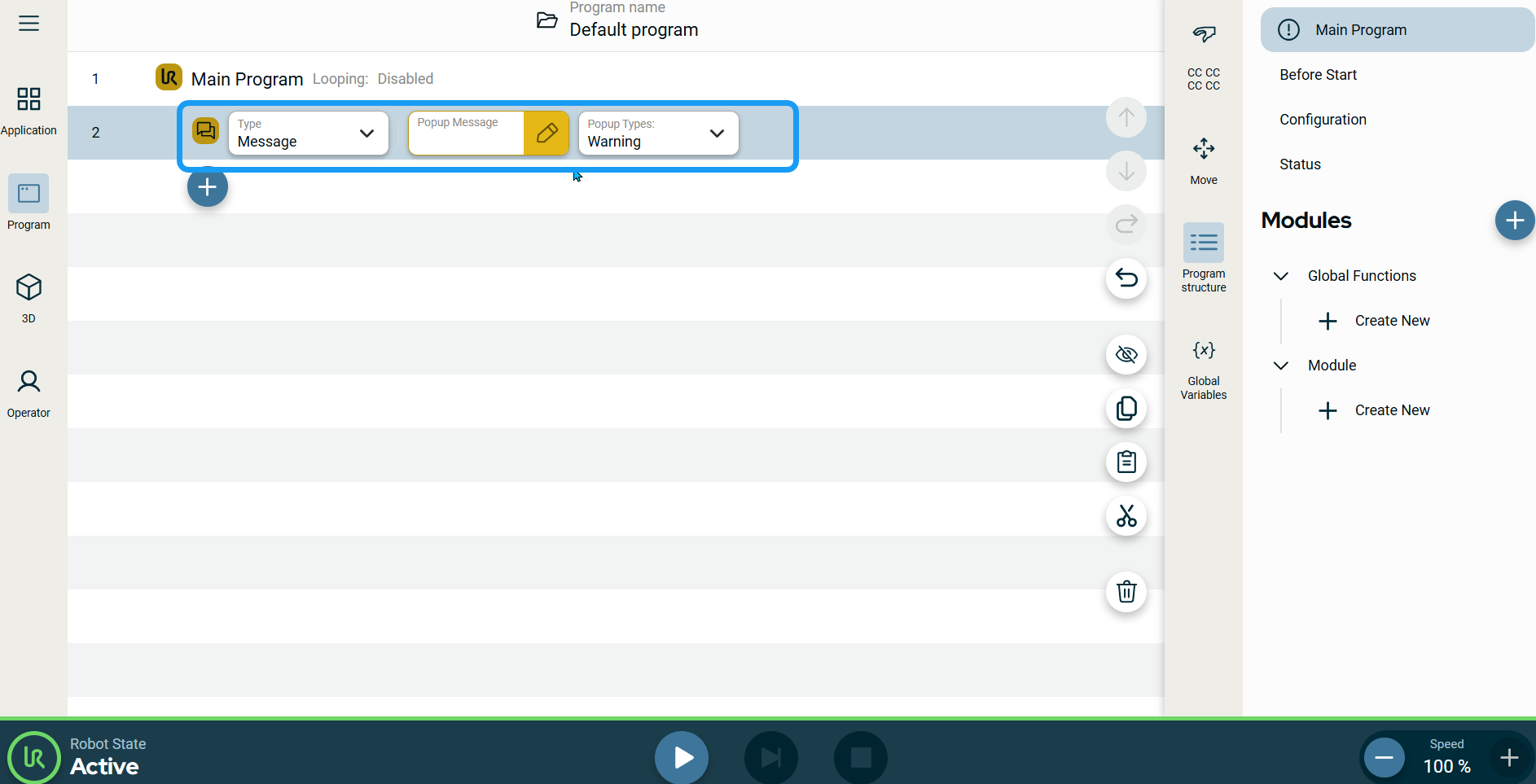 When you select Message in the Type field, the node in the program tree modifies from having four editable fields to two: