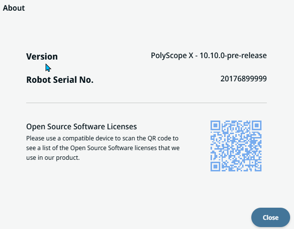 The About function requires no further action to perform in another field or tab. When you tap About, you see the software version, robot serial number, and the QR code of the Open Source Software licenses.