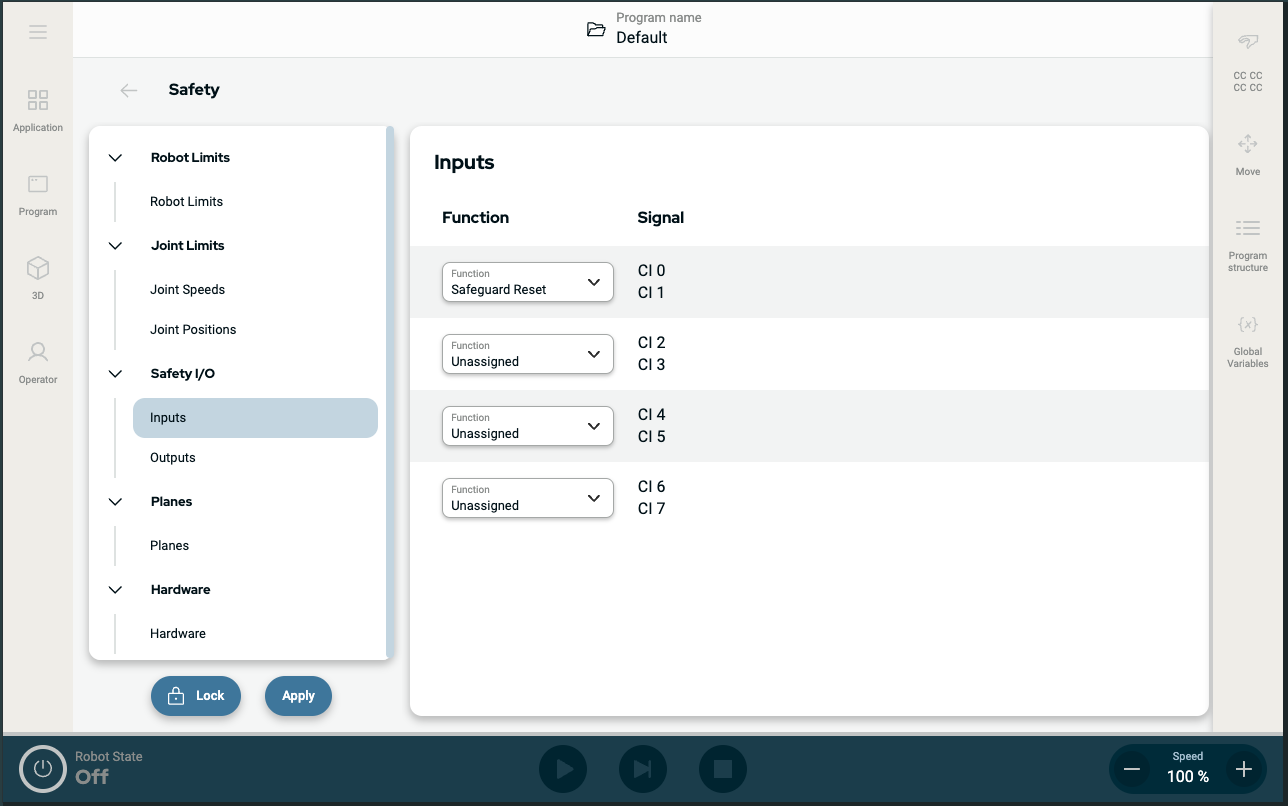 All safety outputs go low in the event of a safety system violation or fault. This means the System Stop output initiates a stop even when an E-stop is not triggered. You can use the following Safety functions output signals. All signals return to low when the state which triggered the high signal has ended: