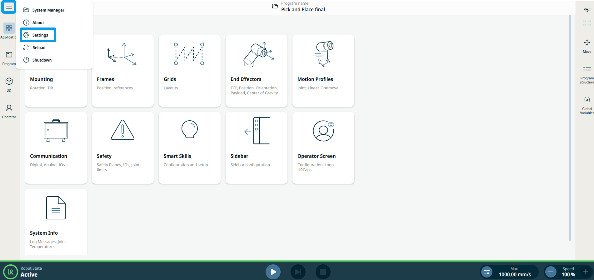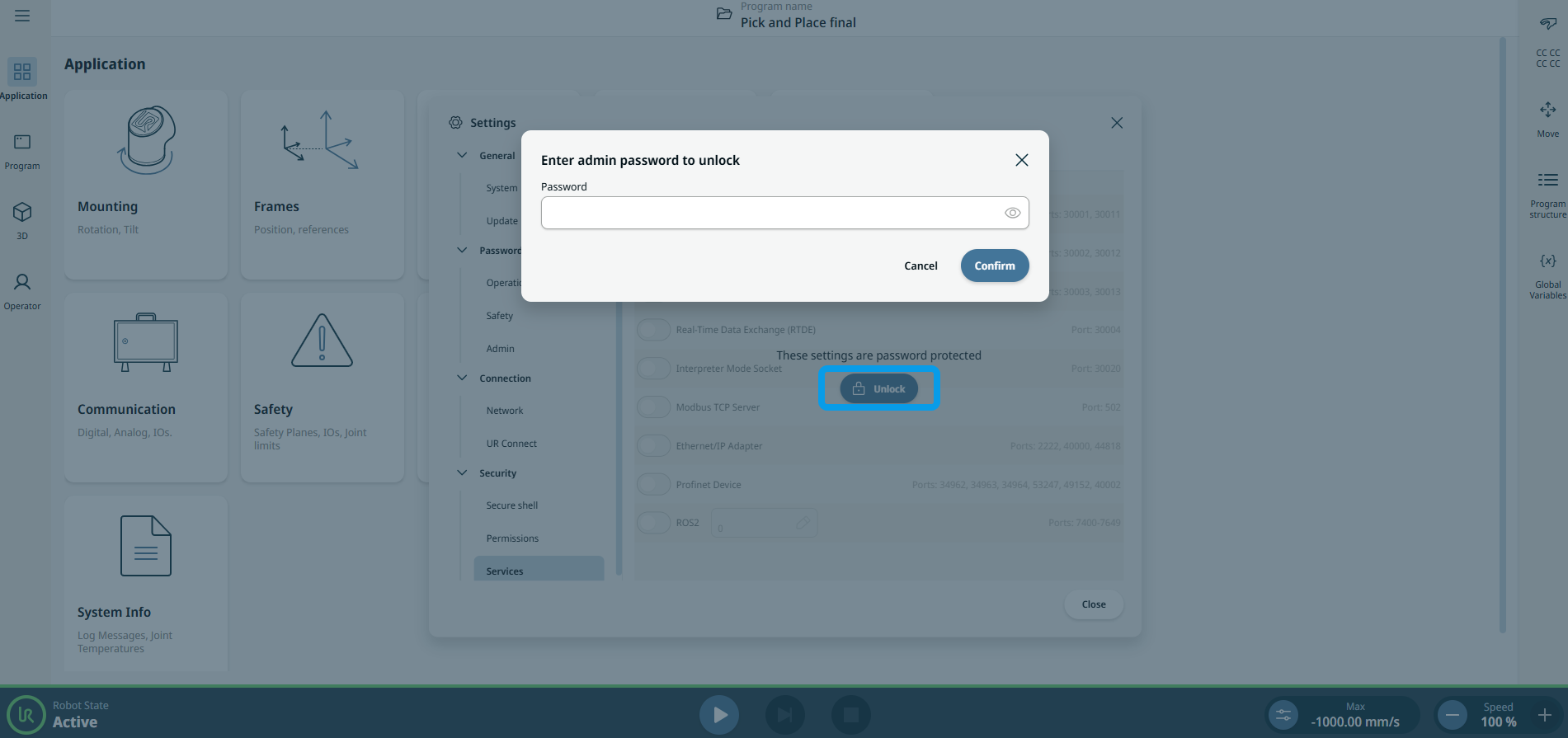 Services lists the standard services running on the robot. You can enable or disable each service. All services are disabled as a security feature and are password protected. When you start or configure your robot, you have to unlock and enable relevant services. An enabled service remains available even if the ports associated with that service are blocked. So, simply blocking a port is not enough to prevent access to the listed services if they are enabled.