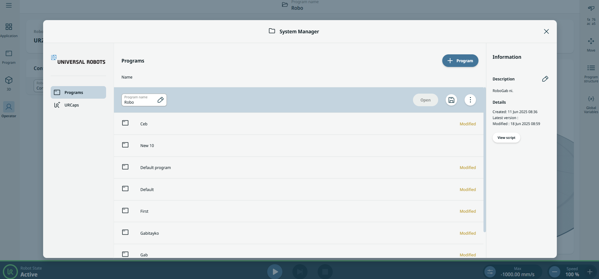 On the left column are found the Program section and URCaps section. On the center column are found the Program Manager, which lists the created program, and the + Program button/icon, which enables the creation of new program and importing a program. On the right column are found the editable Description field and View script button.