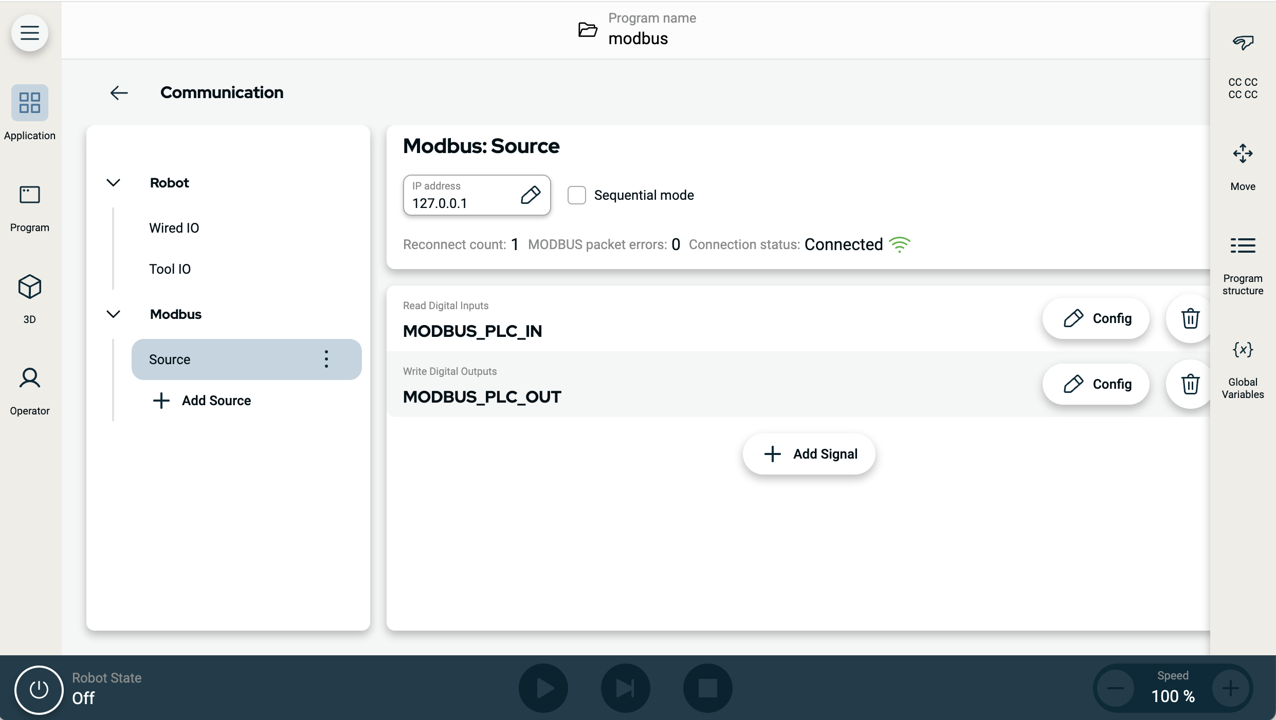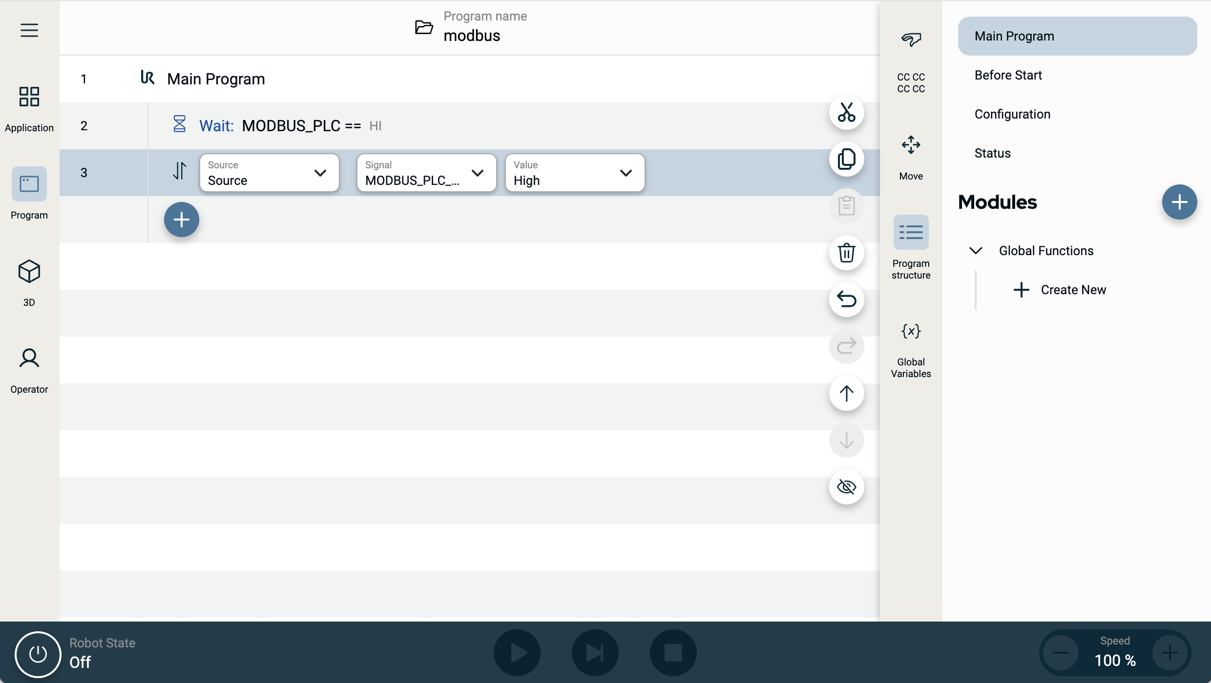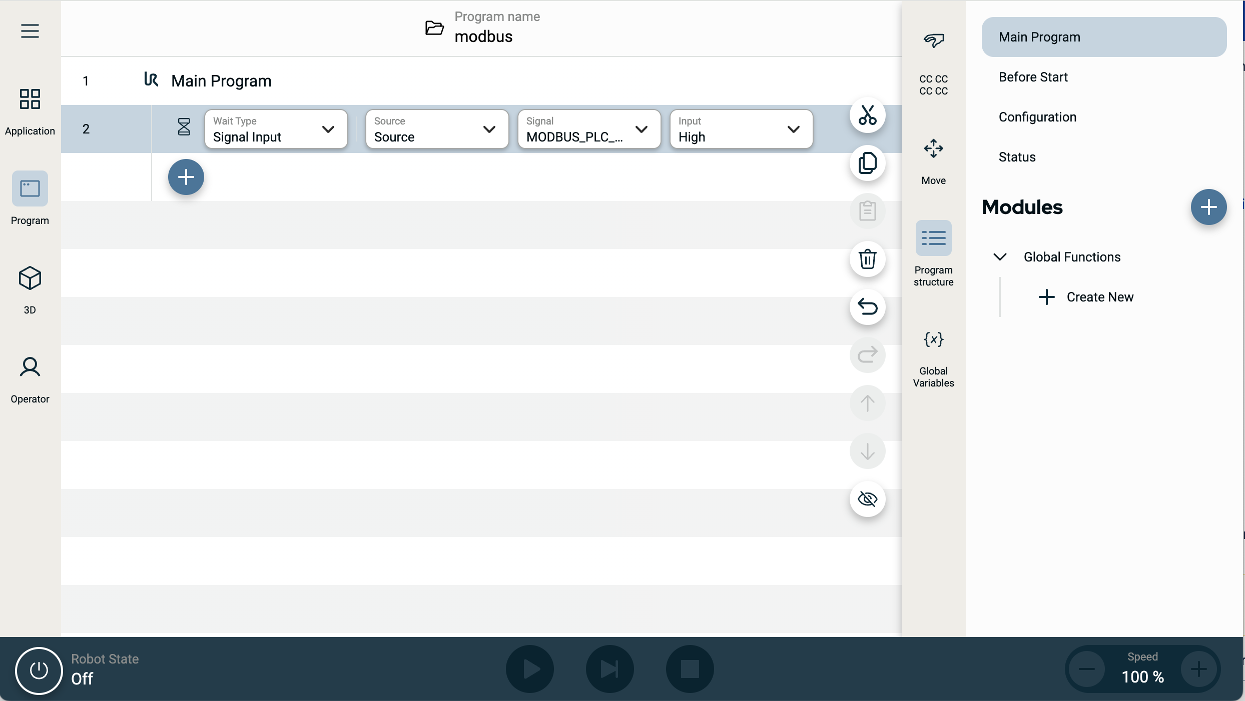 Similar to other input signals, Modbus signals can be monitored. In the Program, on Wait command, select Signal Input under Wait Type. Then choose the Modbus source, the specific input signal, and the state to wait for. Address ranges can not be used in logical expressions. The program can use only single address, even if it is part of a range.