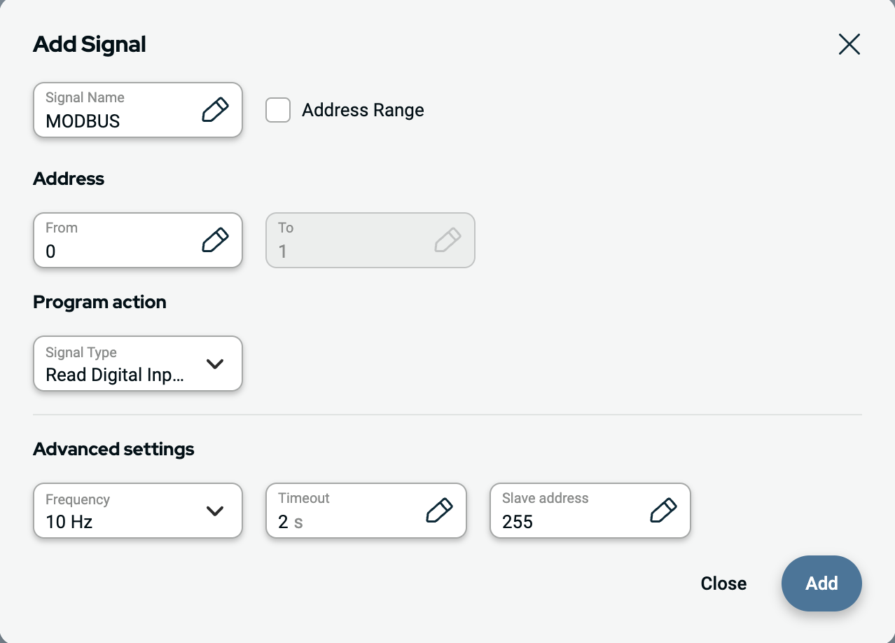 You may customized a signal name when adding a signal. Select the signal type, signal direction and specify frequency, timeout and other advanced settings. Signal could use single address or multiple addresses.