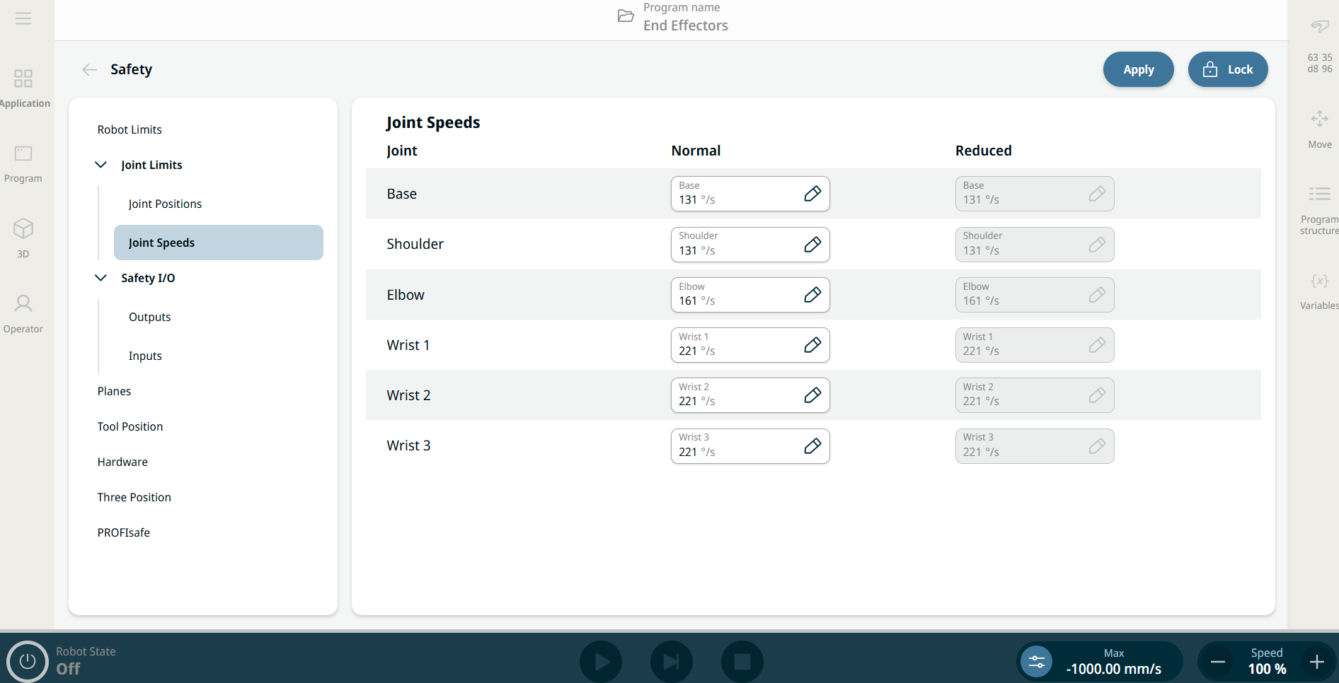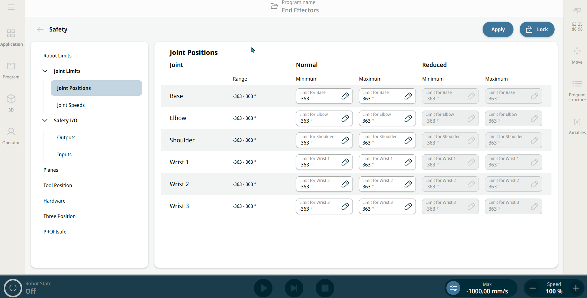 Joint limits allow you to restrict individual robot joint movements in joint space by joint rotational position and joint rotational speed. Joint limiting can also be called software-based axis limiting. These are the robot joints: