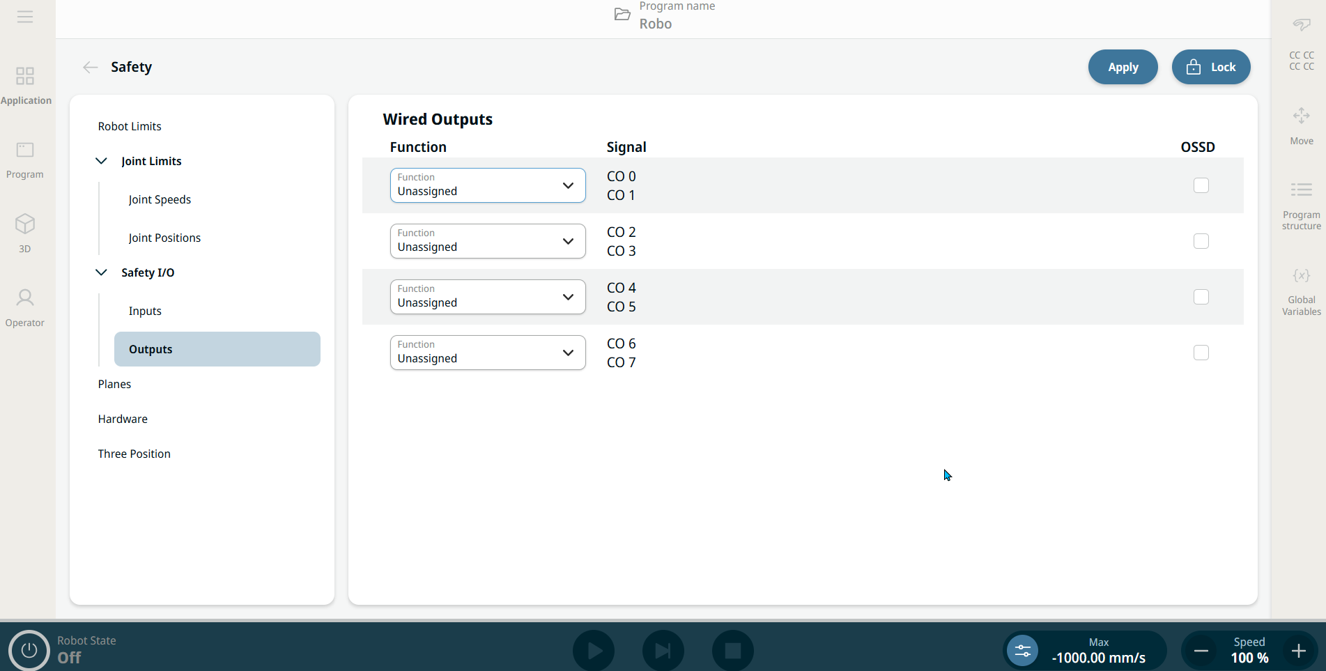 If the robot is stopped while using the Start input function, the robot slowly moves to the first waypoint of the program before executing that program. If the robot is paused while using the Start input action, the robot slowly moves to the position from where it was paused before resuming that program.