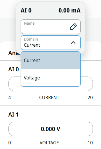 Analog input has two fields for AI 0 and AI 1. It can be set to 4–20 mA. These settings are persistent over restarts of the robot controller and saved in the installation.
