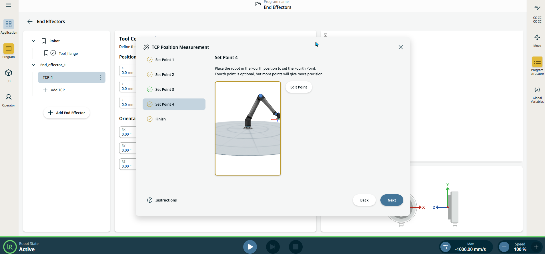 The TCP position wizard assists user in finding the position (translation) of a TCP. This is useful in situations where the position is unknown and cannot be easily measured.