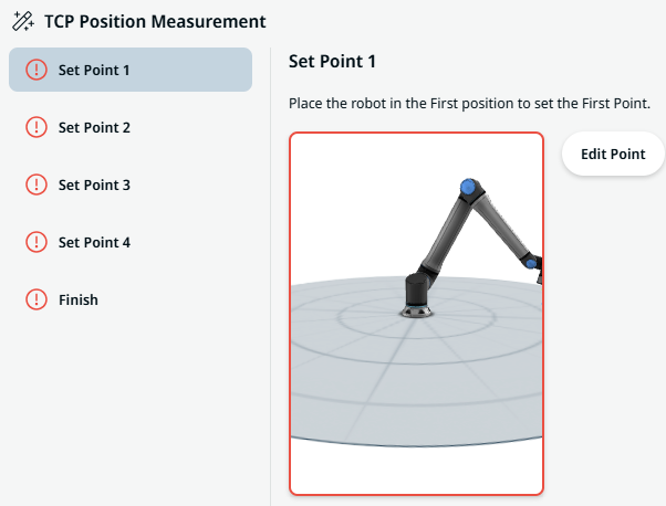 A red warning in Set Points informs user if the taught positions are not sufficiently diverse, in which case it is not possible to compute the TCP position. This means that the positions must be retaught.