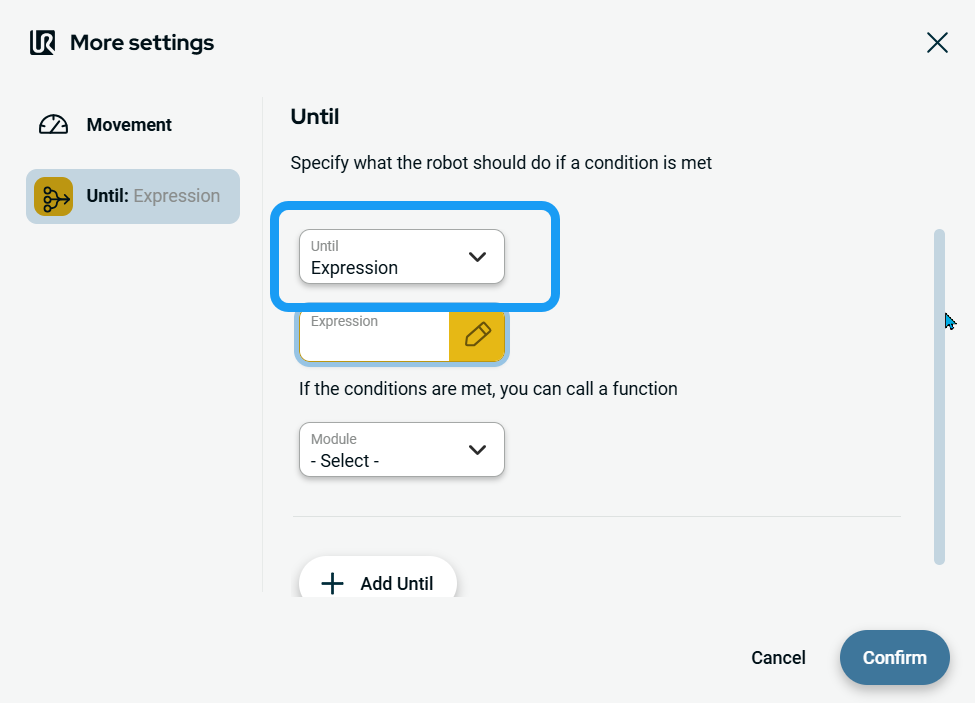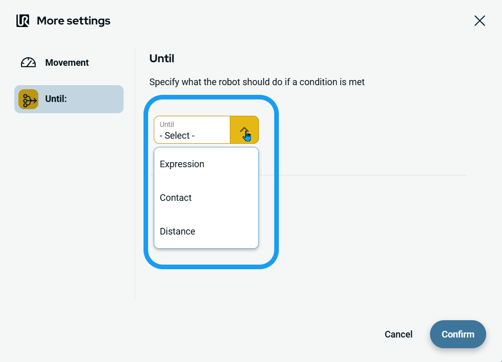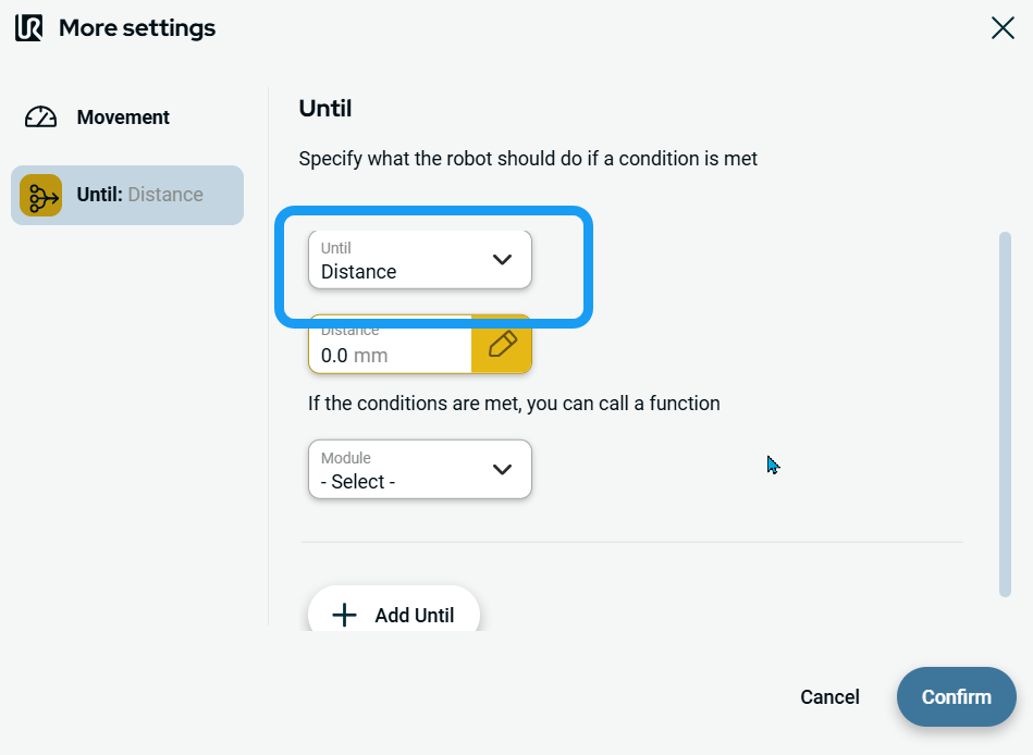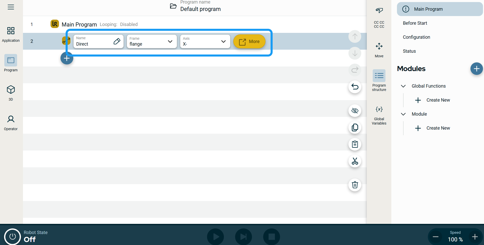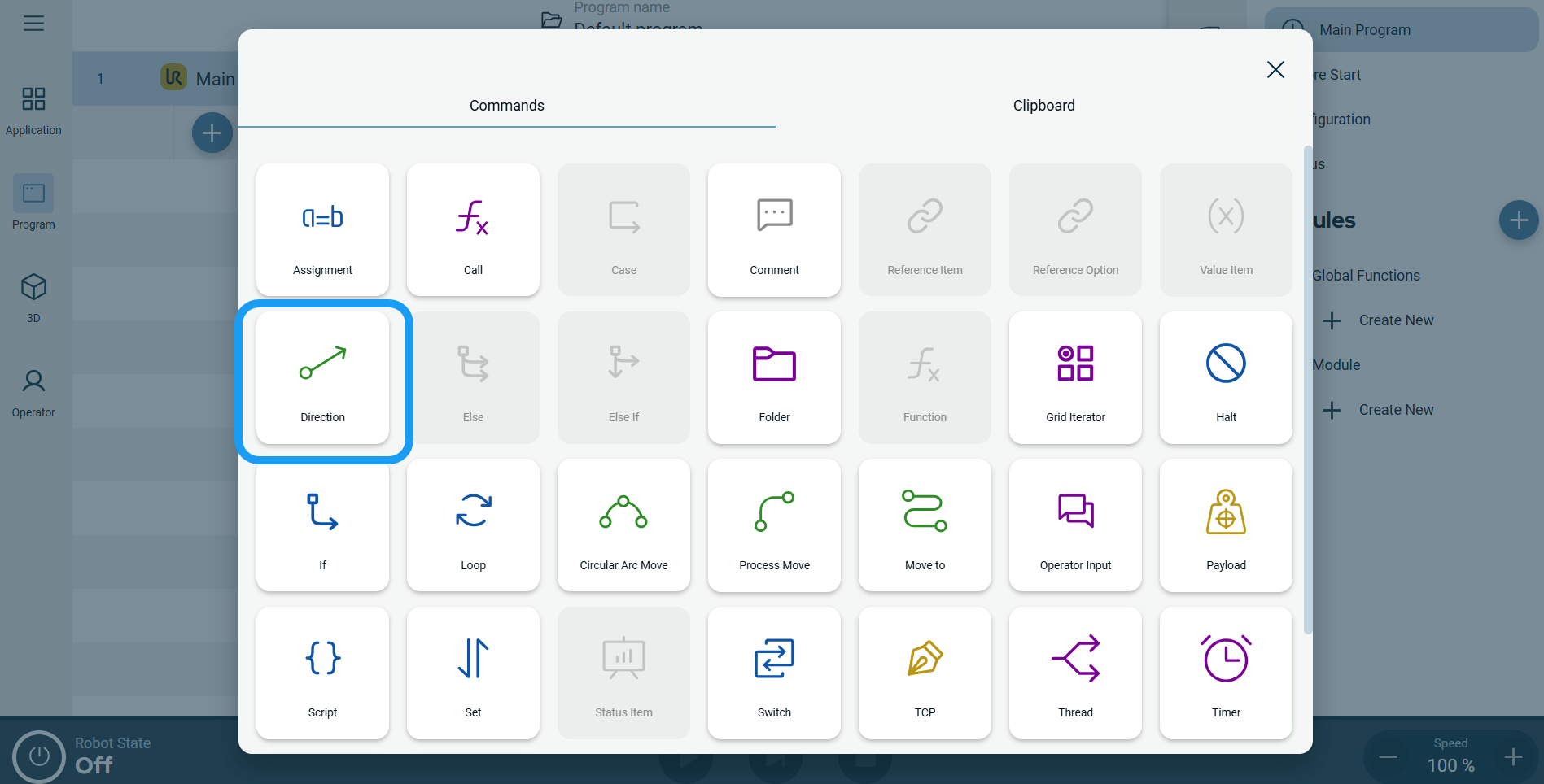 The Direction command enables you to move the robot in a specific direction in a linear motion along an axis. A stop condition halts it.