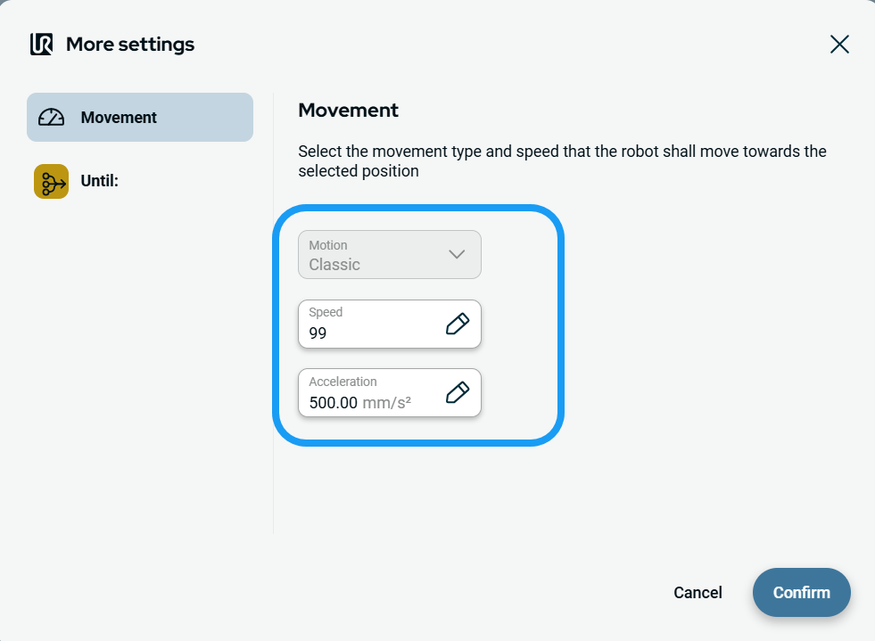 All Move-related command nodes in the program tree display the Motion Profile associated with each node. This feature enables users to see the selected Motion Profile on a Move node. This feature is implemented on the following command nodes: Move nodes with Custom motion profile will display the values for the speed and acceleration instead of Motion profile. |