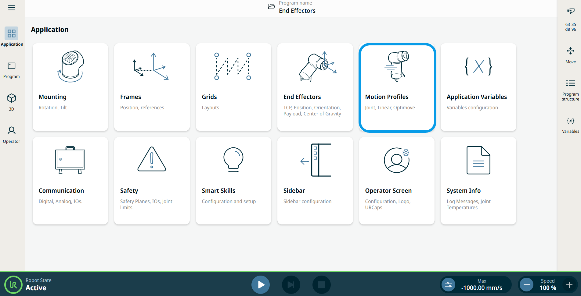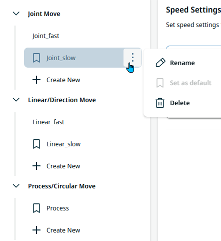 Motion Profiles application allows you to share move parameters across your program by defining speed and acceleration with a profile name. The profile name can then be referred in any new move node in your program, even if the moves are not grouped in a folder. This application applies to the following commands:
