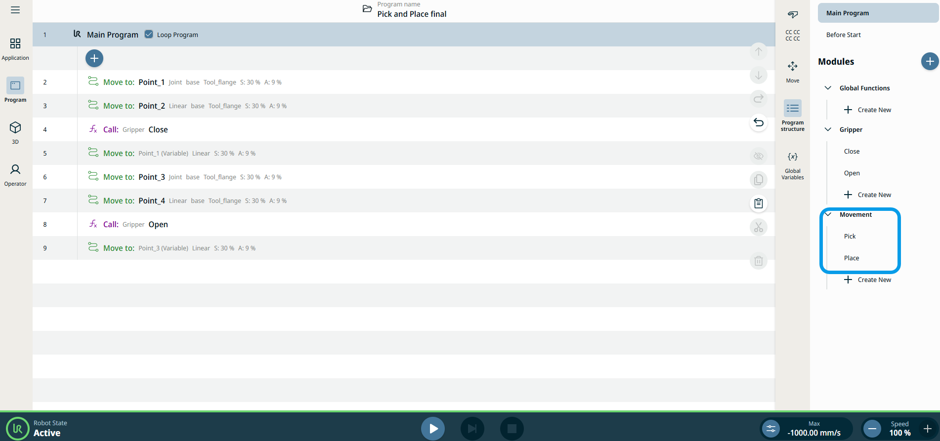 A movement module enables you to reuse Move To command nodes to pick and place an object from one place to another using a gripper.
