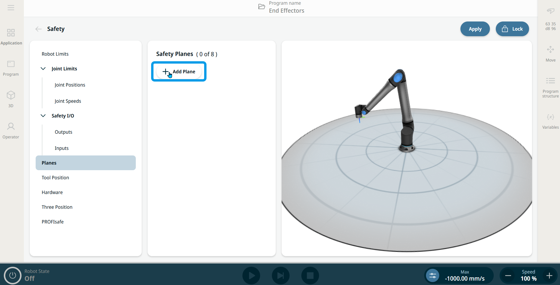 This defines planes in space that limit robot position. Safety planes limit either the tool/end effector alone or both the tool/end effector and the elbow.