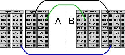 You can use the digital I/O to communicate with other equipment if a common GND (0V) is established and if the machine uses PNP technology, see below.