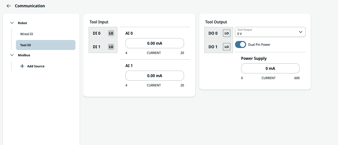 The tool output contains two digital output fields, tool output voltage and power supply current indicator and Dual Pin Power toggle.