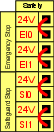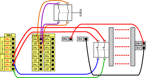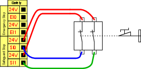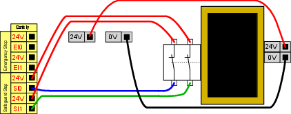Most applications require one or more extra emergency stop buttons. The illustration below shows how one or more emergency stop buttons can be connected.