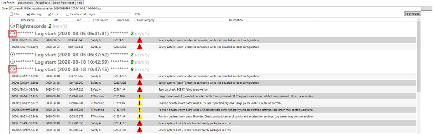 To read the log history section, you must click on the Log Start arrow to open and be able to read where the entries from the robot will be shown accordingly to its date and time and the type of message. The description of the message, error category, error code, error source, time, date and time stamp will be shown after opening the log start entry. You can also press the “Open groups” button to open all grouped entries.