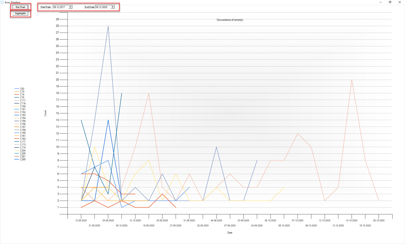 By right-clicking on the Log entry and choosing “Error Default Timeline” or “Error Selection Timeline” a new window will be displayed. It shows you the occurrence of errors over the time. Here you can switch the displayed range of errors, change the type of chart and switch to an accumulated view.