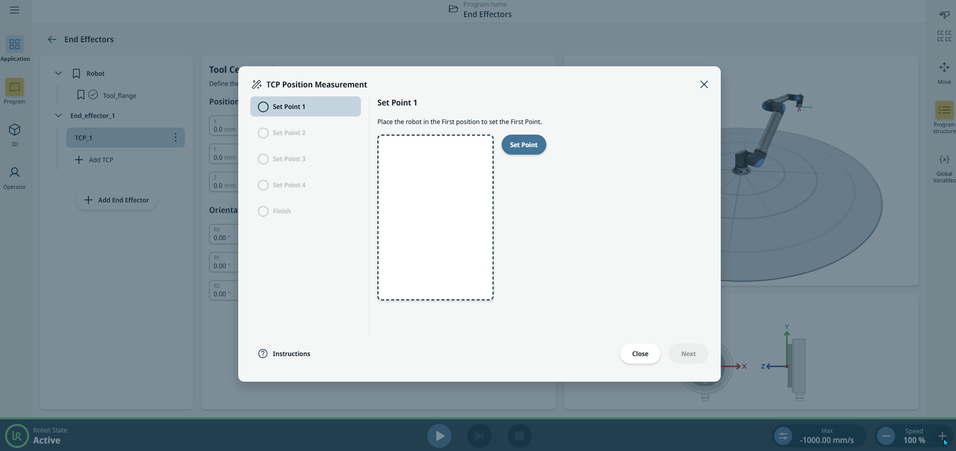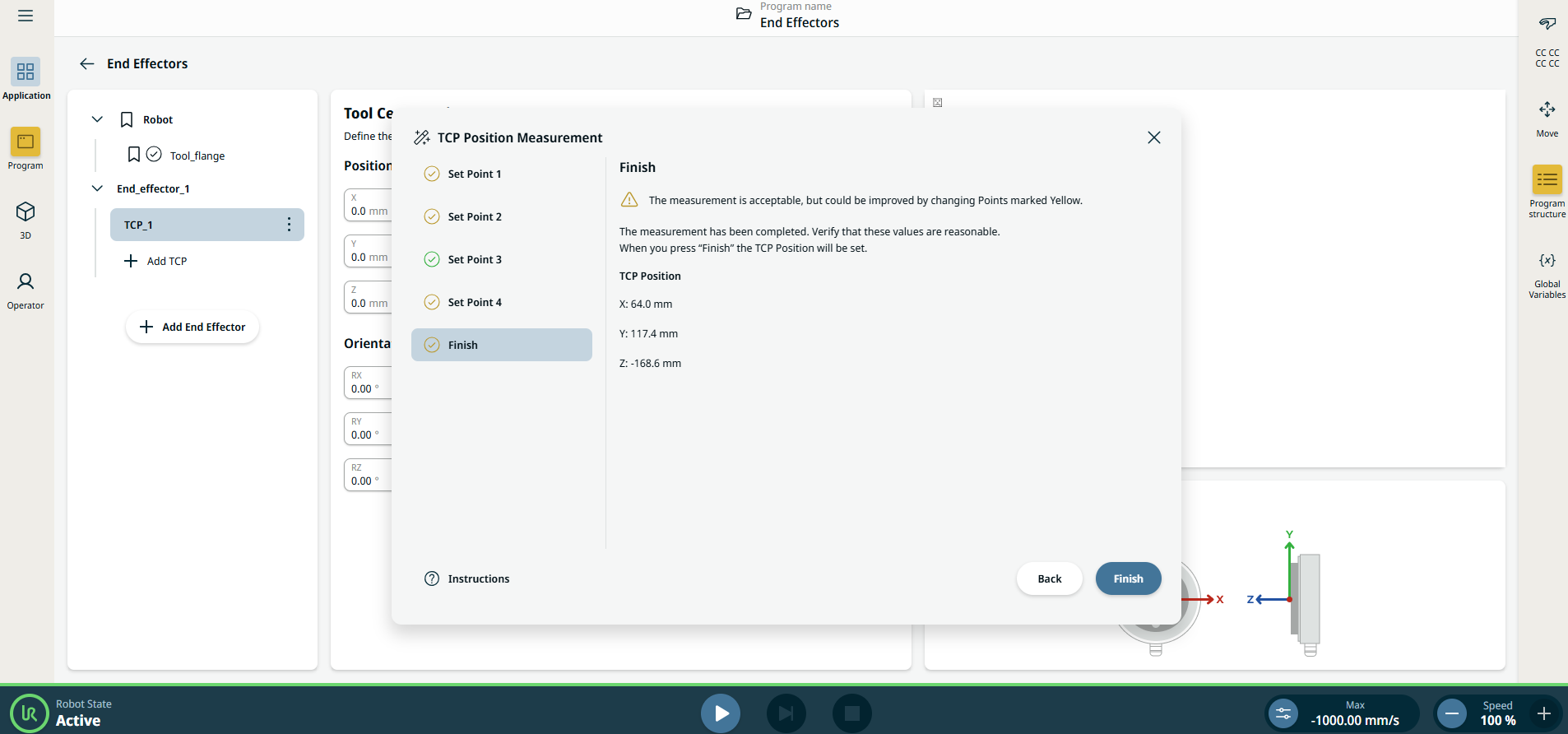 The TCP position wizard assists user in finding the position (translation) of a TCP. This is useful in situations where the position is unknown and cannot be easily measured.