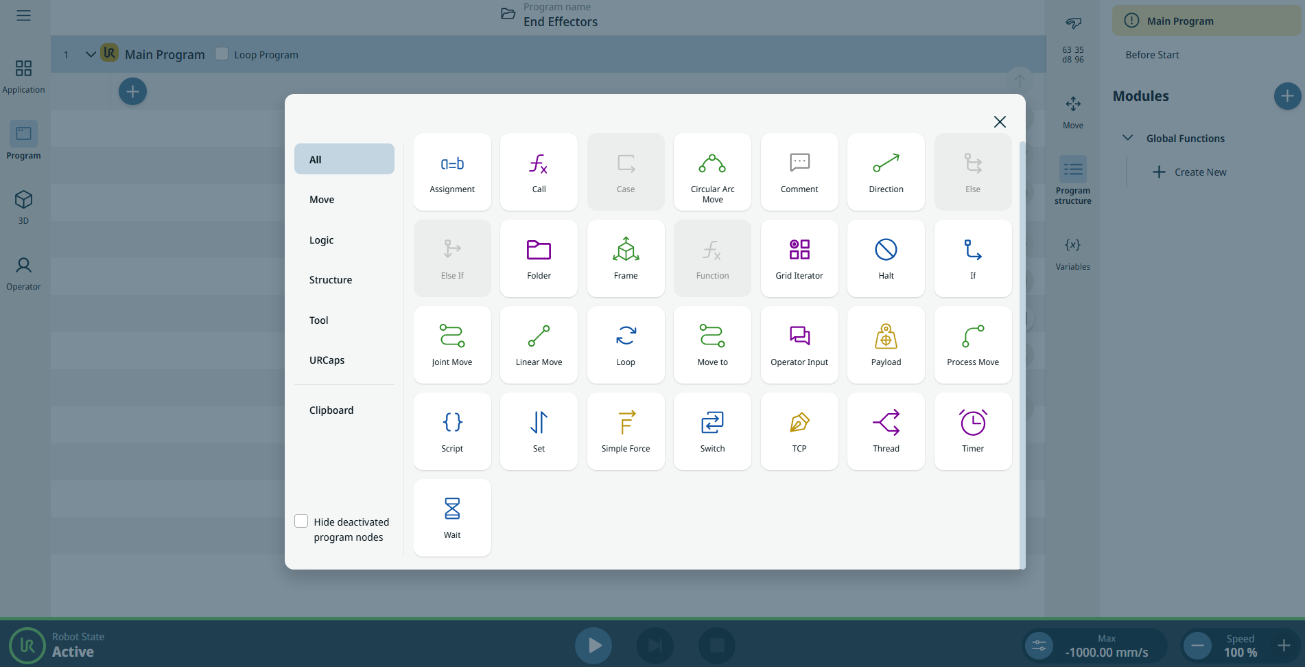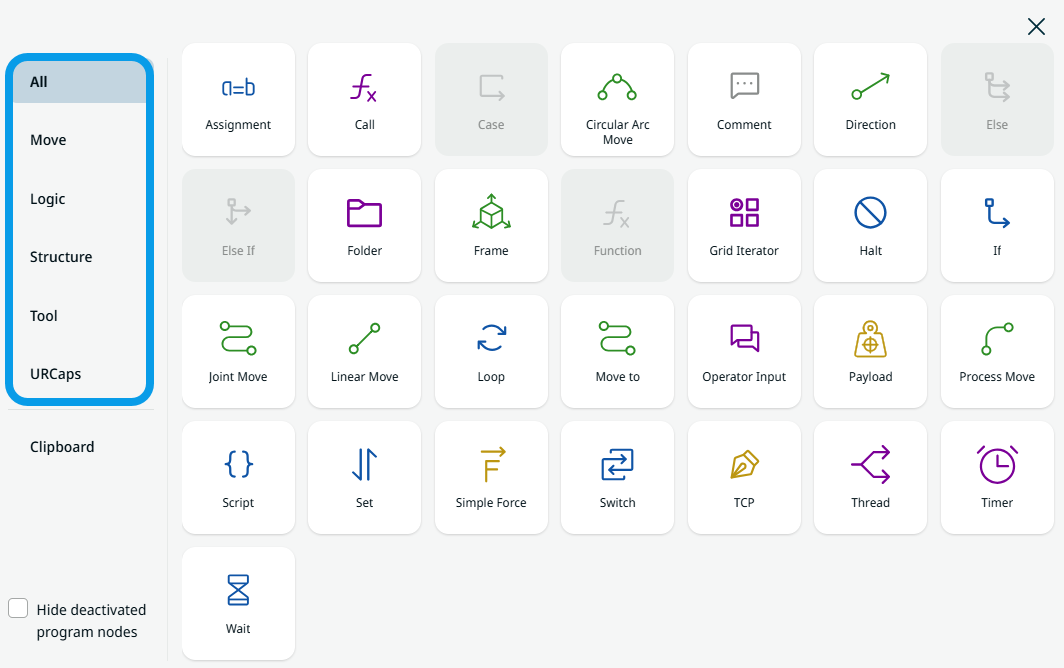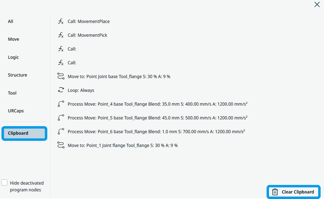 If you prefer to view only the active command nodes, tap Hide deactivated program nodes.