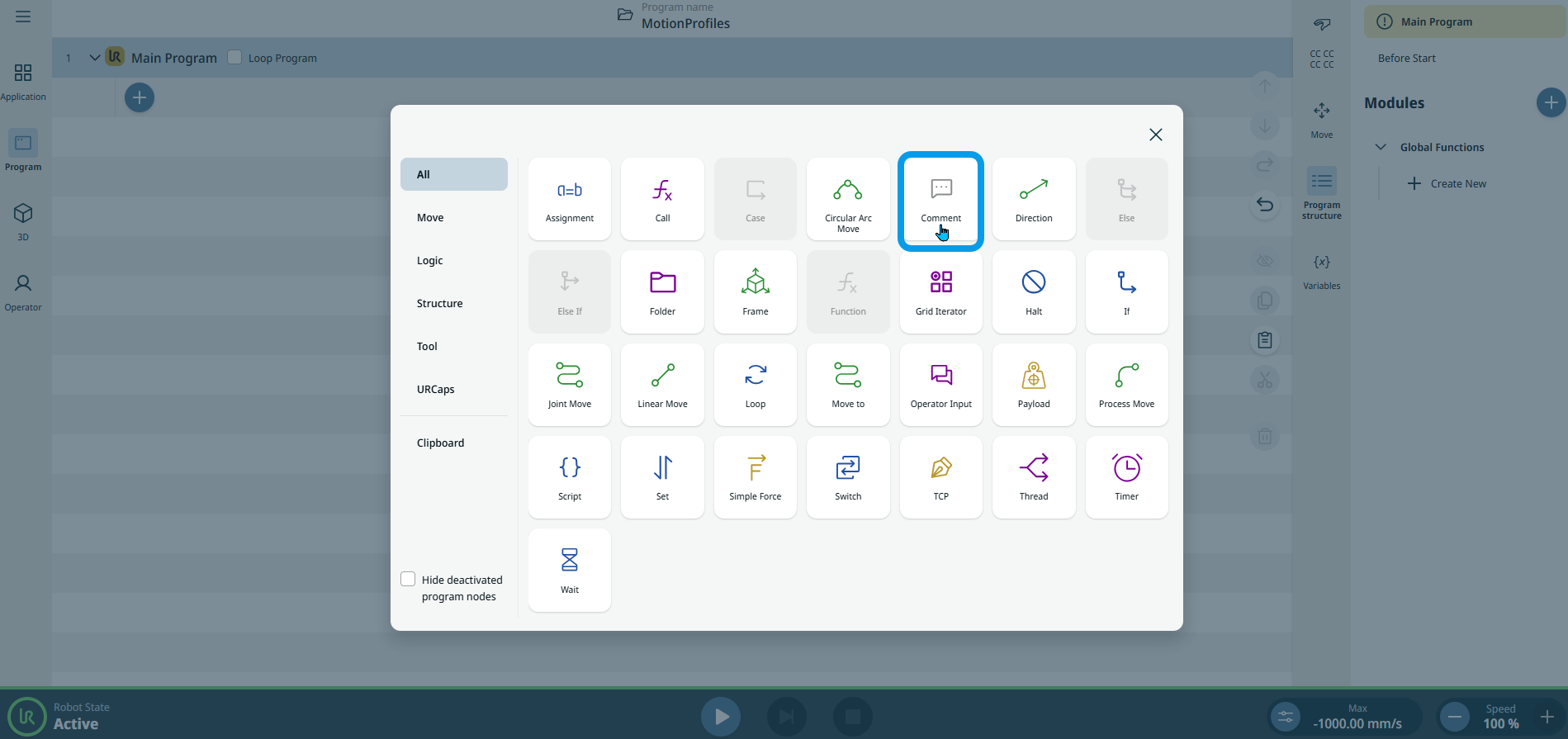 The Comment command allows you to add text descriptions into your program and so enables allows you to keep track of decisions you make while you create or update your robot program.