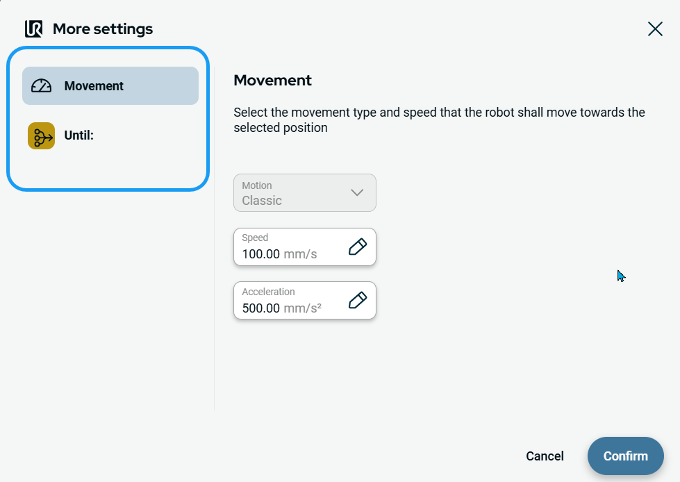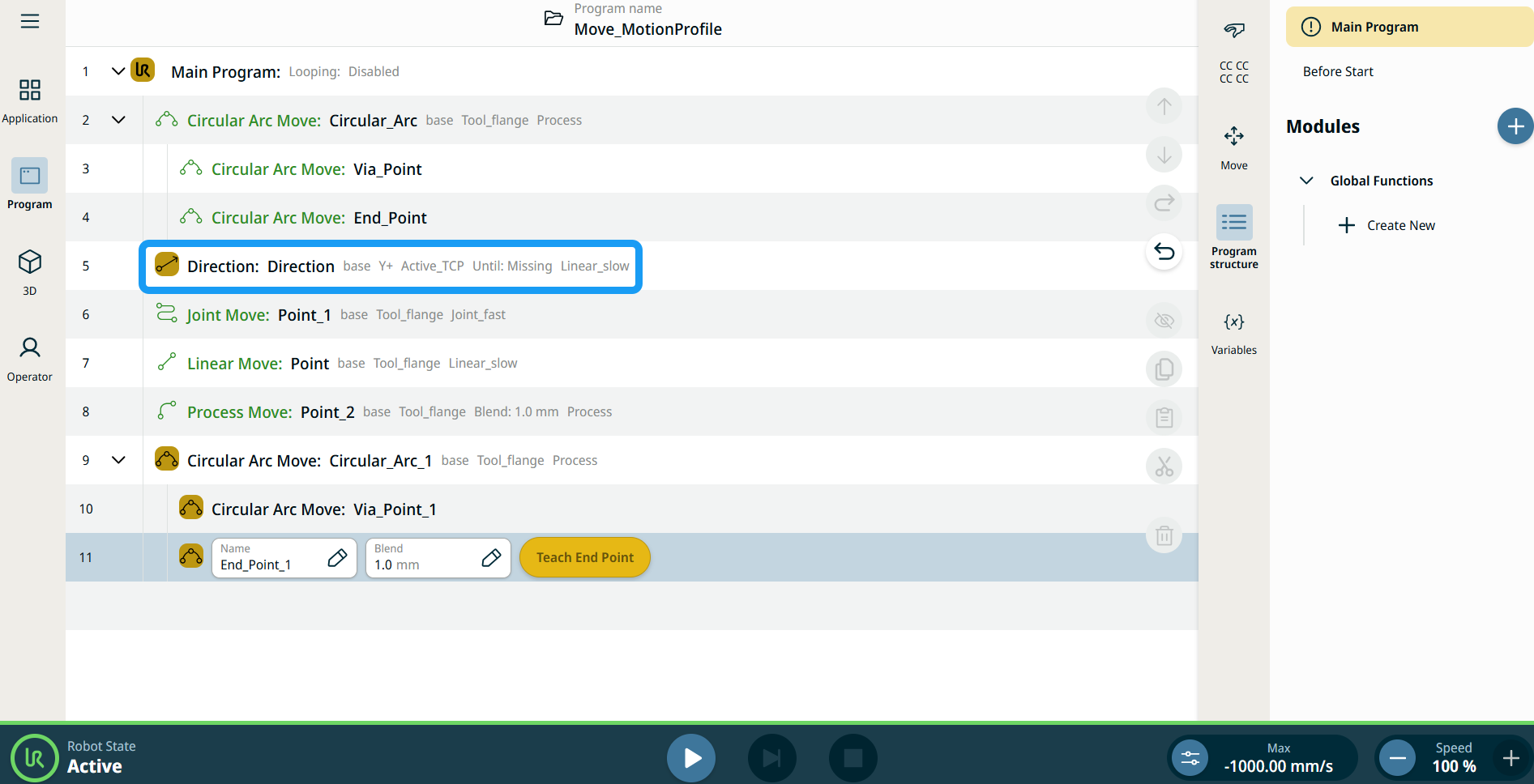 All Move-related command nodes in the program tree display the Motion Profile associated with each node. This feature enables users to see the selected Motion Profile on a Move node. This feature is implemented on the following command nodes: Move nodes with Custom motion profile will display the values for the speed and acceleration instead of Motion profile. |