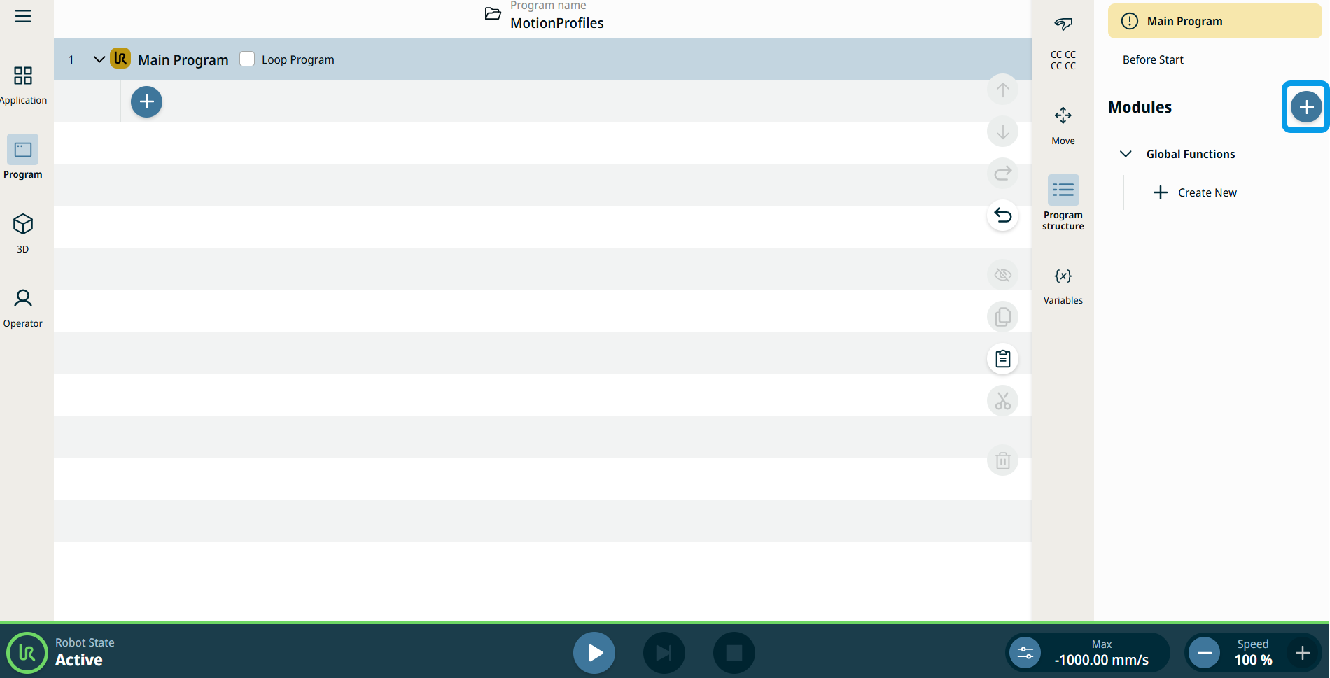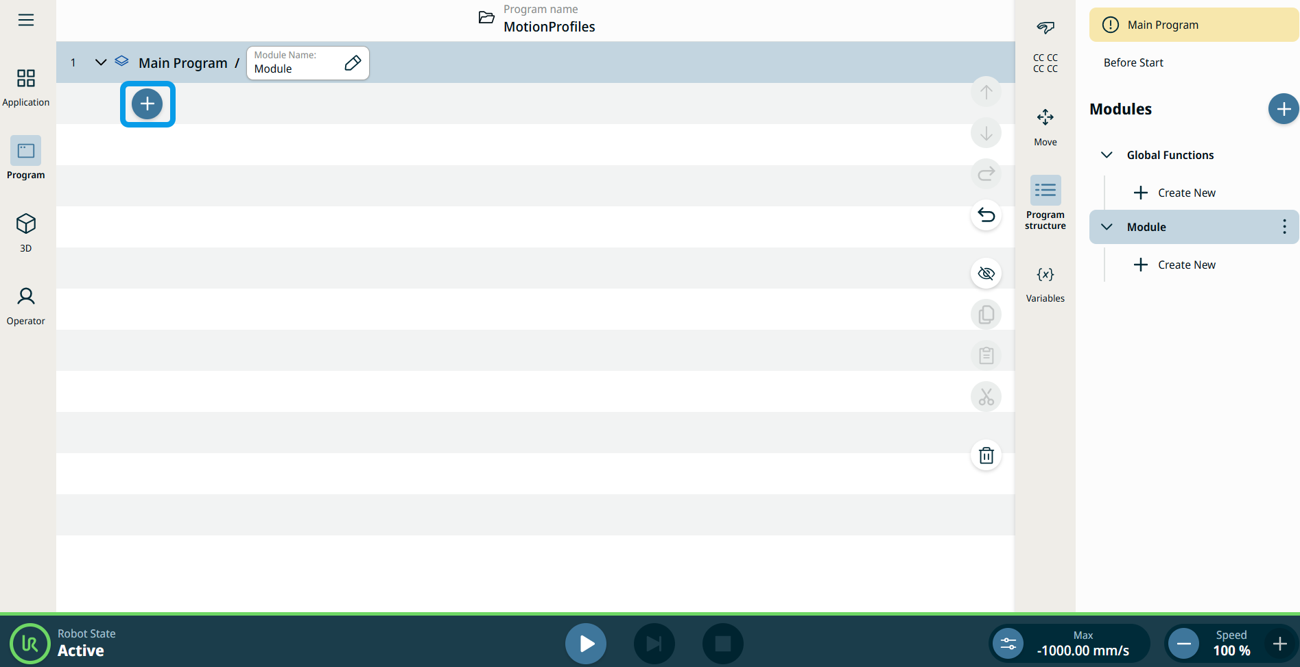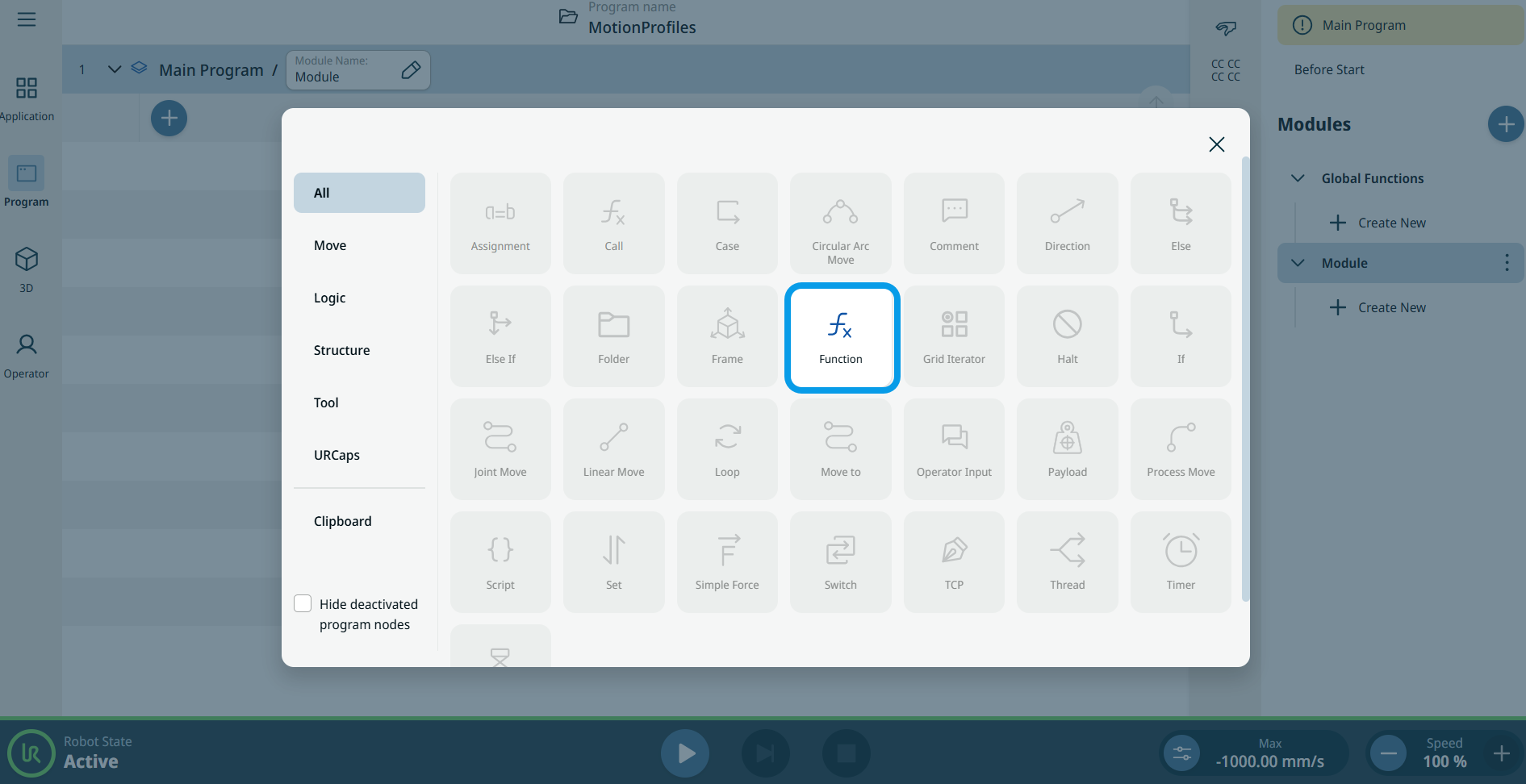 The Function command allows you to perform a specialized operation, like performing calculation, moving the robot, and other similar movements. The function will not be executed until the call command. It is only insertable inside a module or from the Global Functions.