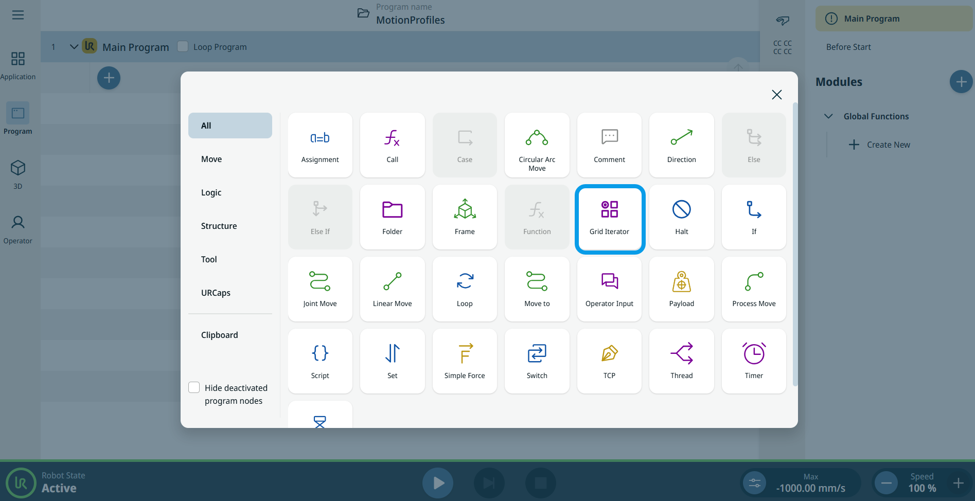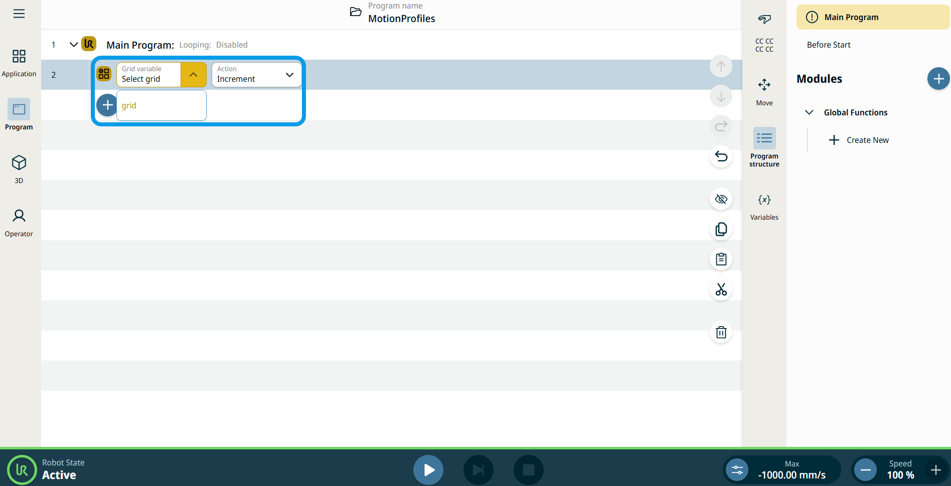 Each increment moves the variable to the next grid position. The pose variable, grid_iterator, can be used as the target in a Move node instead of a fixed waypoint, enabling sequential motion through the grid layout.