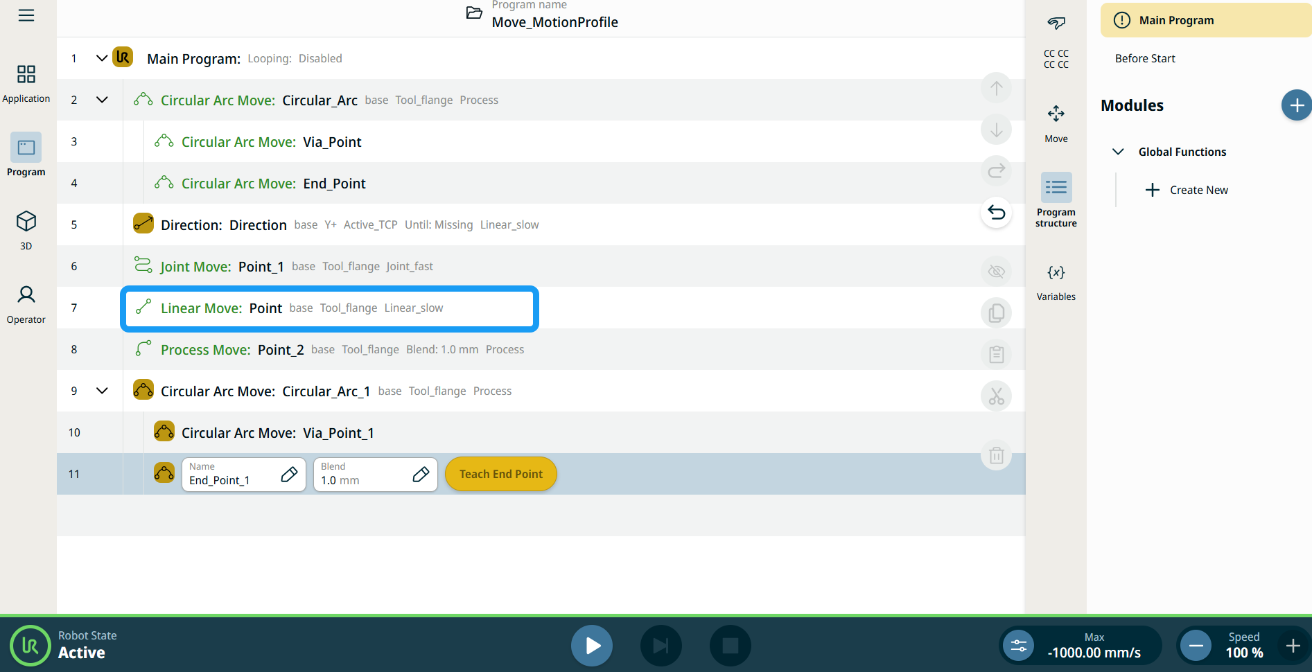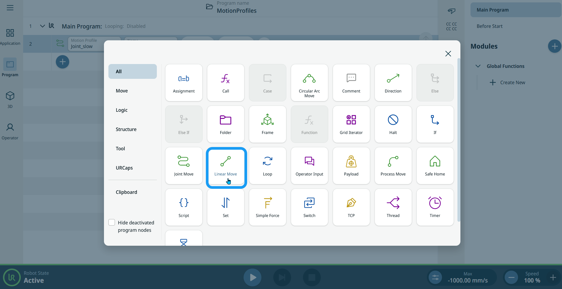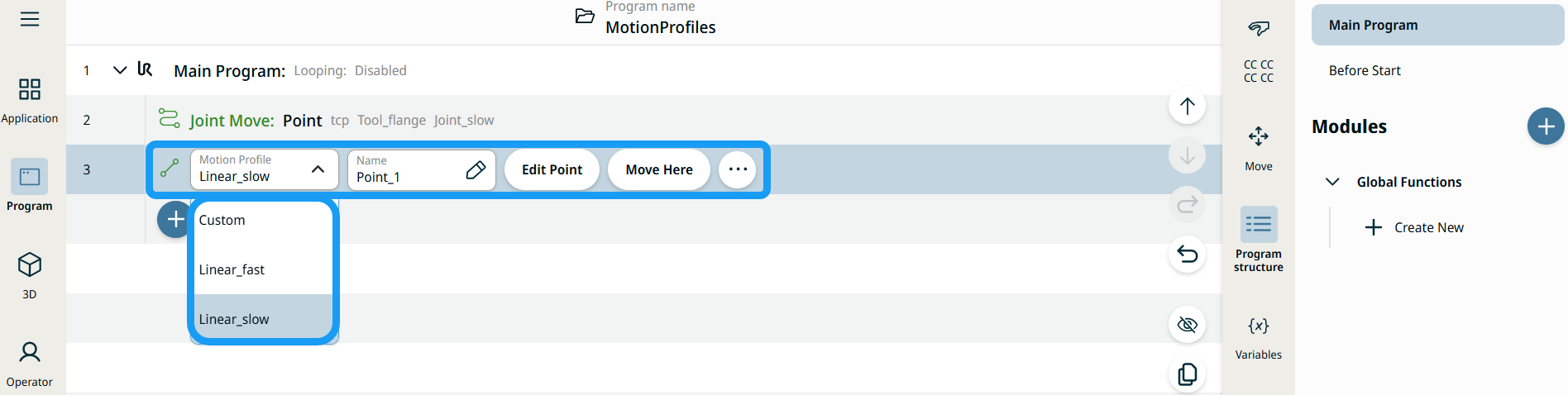 All Move-related command nodes in the program tree display the Motion Profile associated with each node. This feature enables users to see the selected Motion Profile on a Move node. This feature is implemented on the following command nodes: Move nodes with Custom motion profile will display the values for the speed and acceleration instead of Motion profile. |