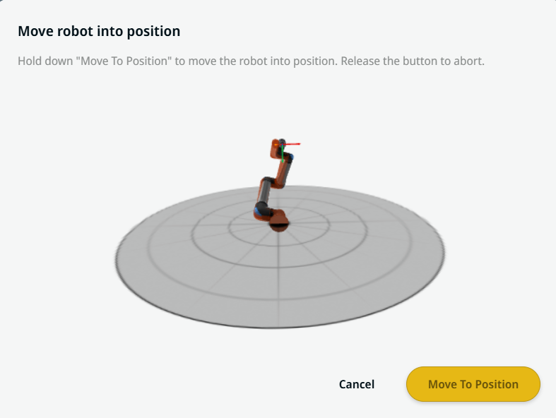 The Move Here button is seen in Linear Move and Joint Move commands. This feature enables you to move to the position of a waypoint directly from the program tree. Pressing the Move Here button opens the Move robot into position dialog. The button is visible when the waypoint has been taught and is only enabled when the robot status is in Normal or Reduced mode.