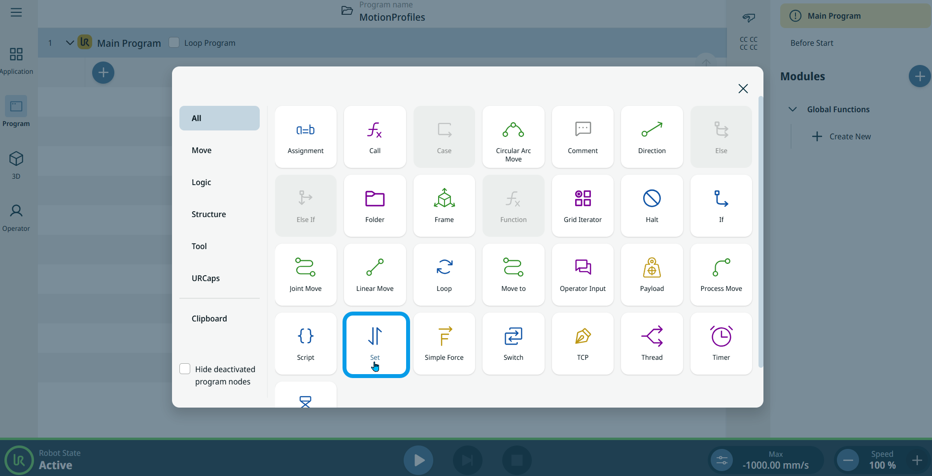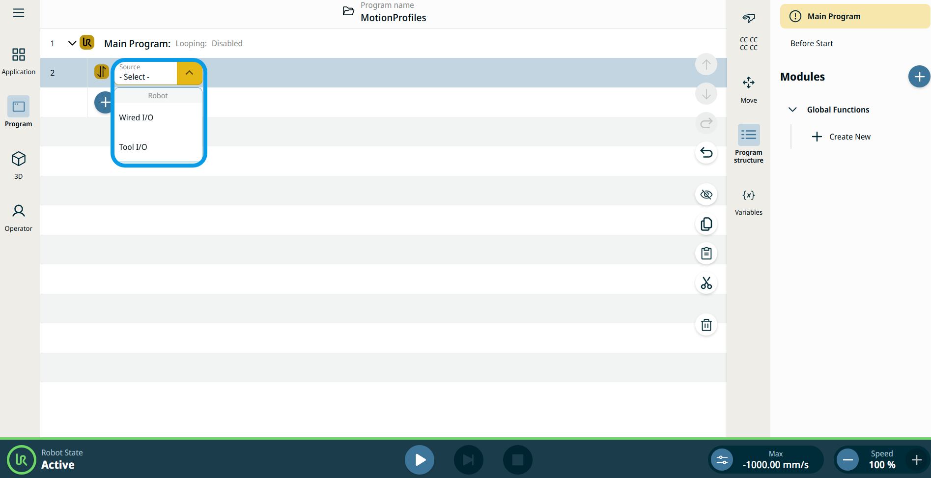 A node with an editable Source field is inserted into the program tree that enables you to select Wired IO and Tool IO.
