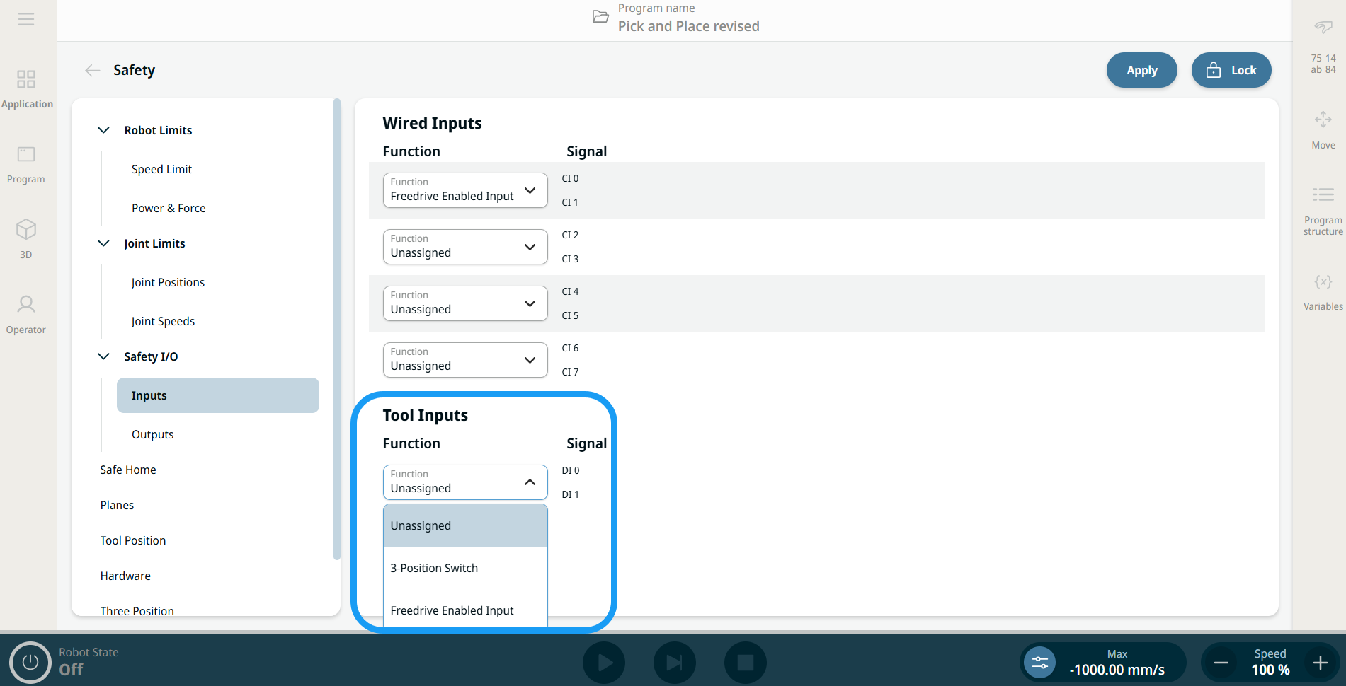 On UR8 Long robots, the Freedrive Enabled Input and 3-Position Switch safety functions can be assigned to the Tool Inputs on the application Safety screen.