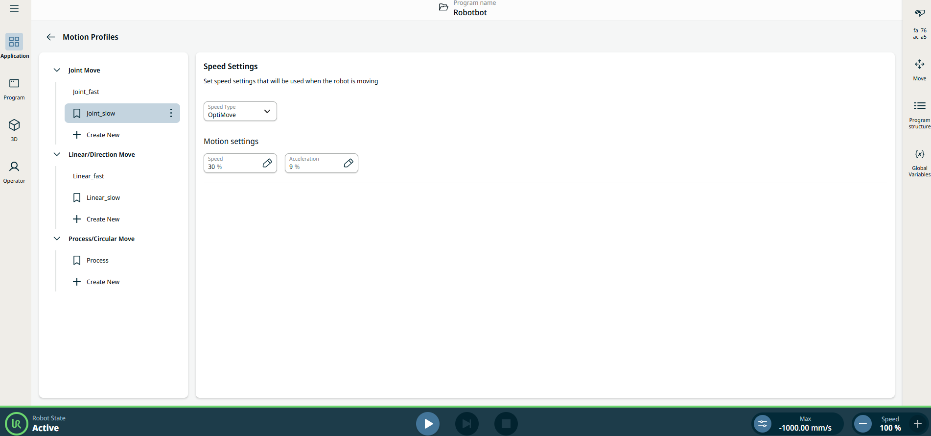 Note: Derived program nodes will use the profile for their underlying move type. Joint Move for joint profile. Direction node for linear profile. Circular Arc Move for process profile.