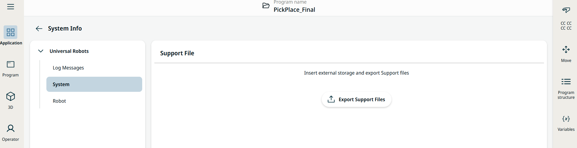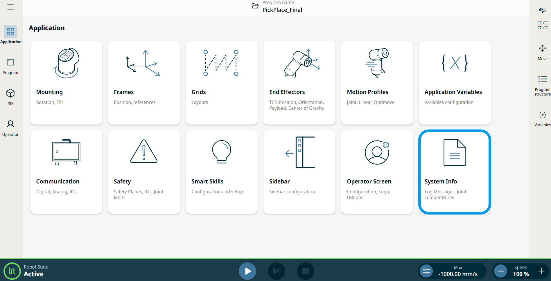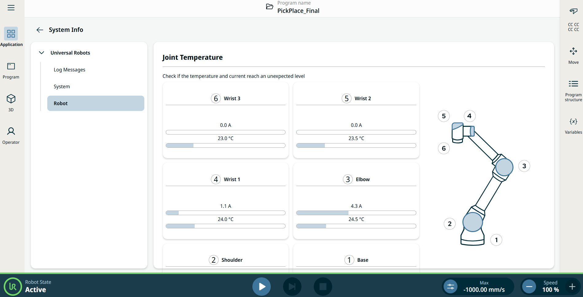 The System Info screen lists all log messages from the system, enables exporting support files, and checks if the robot join temperature and current reach an unexpected level.