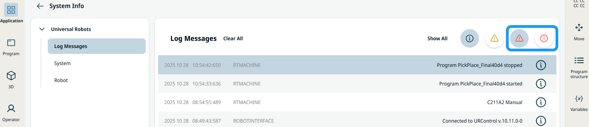 The Log Messages page lists all log messages from the system. The page has four buttons at the top of the messages list. The two red buttons allow for filtering on messages for faults and violations independently. The rightmost filter button shows/hides violations, whereas the filter button next to it shows/hides faults.